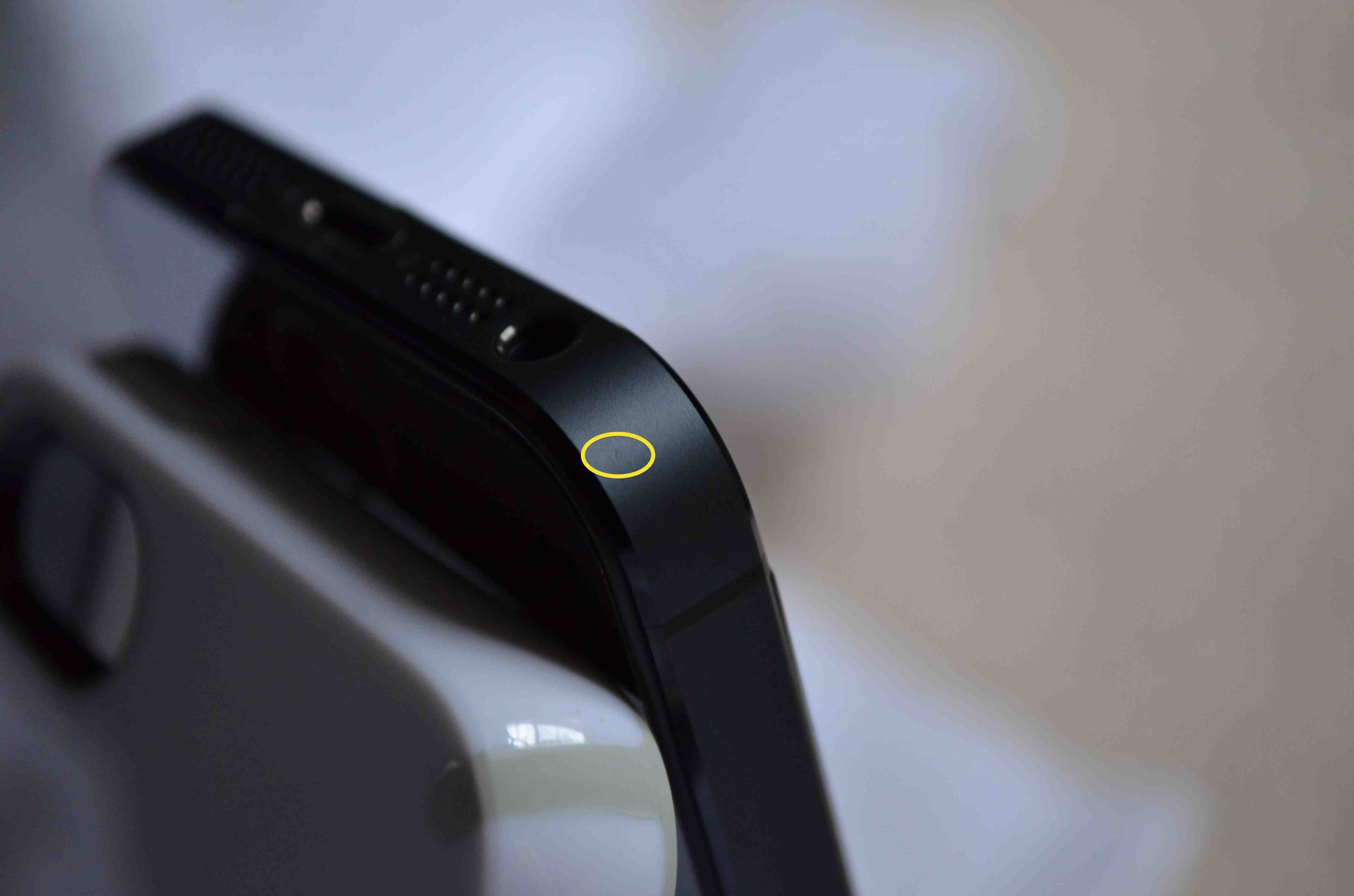 So today I was cleaning a replacement phone that I got about a week ago from the Genius Bar, and I noticed a small dent/chip on the side (not on the chamfer, on the actual side and not more then a mm in size, probably less) however, it is still anodized over, I looked at my case (speck candyshell) and I saw something that is around the same size and in around the same place, but I think it is just a defect in the rubber. My question is, could the case have caused this, or was it out of the box like this but I didn't notice? I've only had it for a week.
