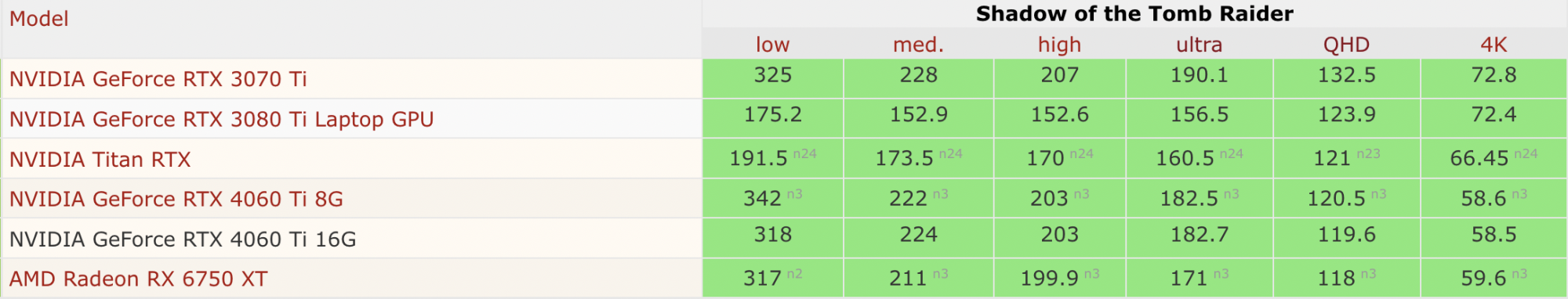 These numbers look dubious. I looked up a number of 4090 (@ 1440P & 4k) Shadow of the Tomb Raider benchmarks and every one of them beat the supposed M2 Ultra numbers. (See https://www.theverge.com/23398201/nvidia-rtx-4090-review-test-benchmark for example).