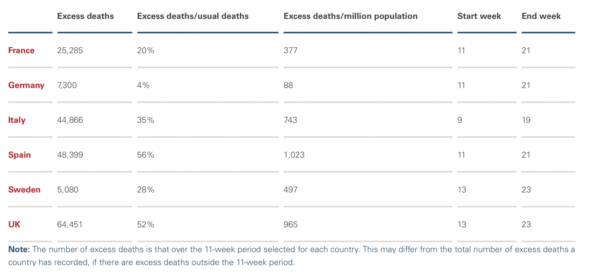 As countries emerge from the first wave of the COVID-19 pandemic, meaningful comparisons have become possible. We compare excess deaths in the UK with other European countries to understand more about their different experiences.