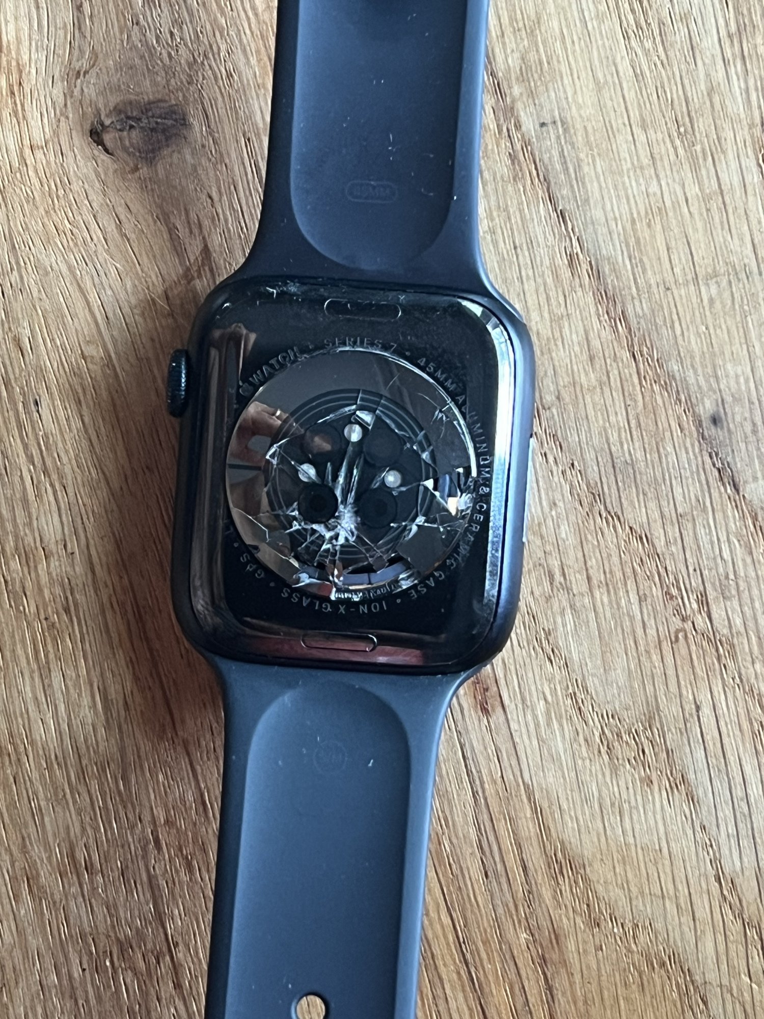 There’s a clear point of impact along the 6 o’clock line, midway between the center and edge. This is not a random “just happened”; rather, it’s a case of the watch being dropped or hit while not on your wrist.