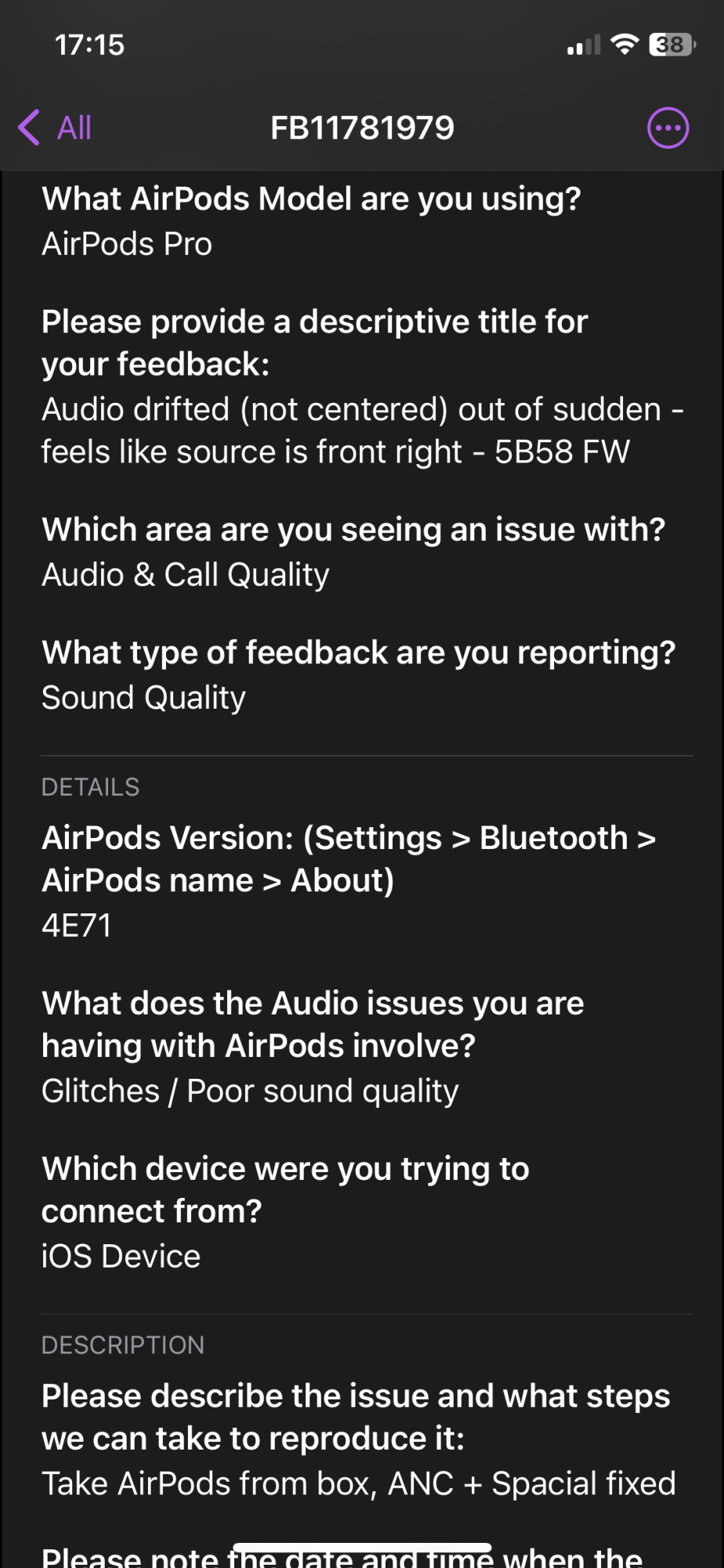 This is exactly what I was going to post. Why do you have to go through the Spanish Inquisition for an annoyance bug. Shouldn't it know some of the answers based on logs or such??View attachment 2113447Of course Feedback is a crap.