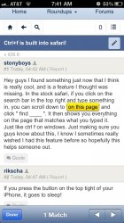 Hey guys I found something just now that I think is really cool, and is a feature I thought was missing. In the stock safari, if you click on the search bar in the top right and type something in, you can scroll down to "on this page" and click " find ____ ".  It then shows you everything on the page that matches what you typed it. Just like ctrl f on windows. Just making sure you guys know about this, I know I sometimes really wished I had this feature before so hopefully this helps someone out.