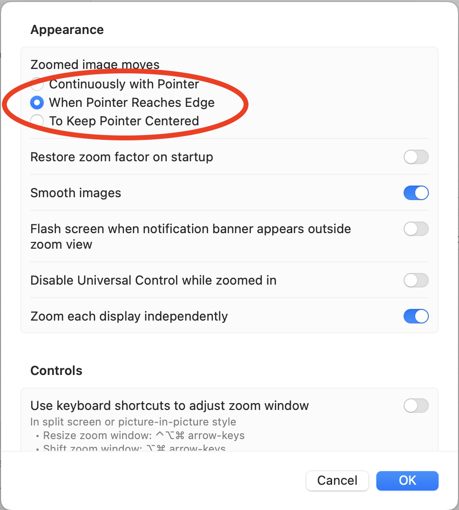 I can still zoom in with ctrl + scroll like before. However, when the screen is zoomed in, I cannot drag the cursor to the edge of any of its borders to force the screen to move in that direction like it usually does. Now it's just stuck. The cursor cannot move the zoomed in screen in any direction.
