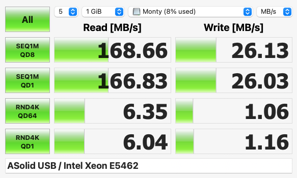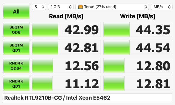 Here are readings from a Teamgroup MP44 256GB NVME in a Satechi enclosure connected with a USB C-USB-A adapter (USB 3.1). Don't they look rather low? It might be the adapter, which is a Delock I found on Amazon. But I would have expected better read speeds.