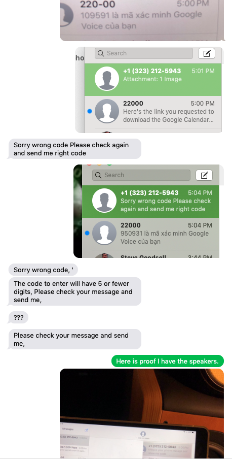 Downsizing and selling my HT. Posted my speakers on Craigslist and got a response. Wanted to send me a verification code from Goggle Voice. Smelled phish so I Goggled (or Duck Duck Goed). The scam requires the person to have your Gmail account. This person had nothing and I don’t use Gmail (even told them). I never opened any of the text messages and deleted out of precaution. Now I can’t see why they contained. What would sending this code to the scammer accomplish, especially on my iPhone? Here are the pics of the conversation.