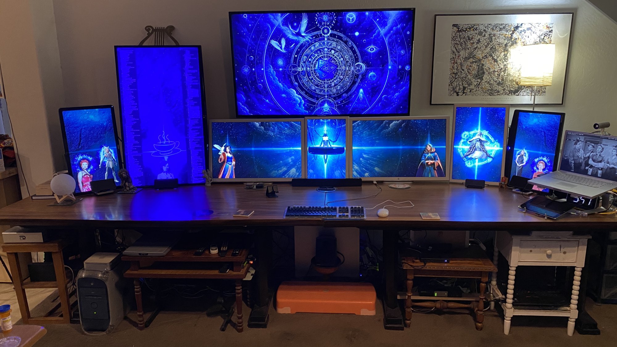 I sit in front of this for 16+ hours a day. While there is a work M2 MBP in there (clamshell mode), the 2009 MacPro running Mojave is 'the most important product' in this picture.