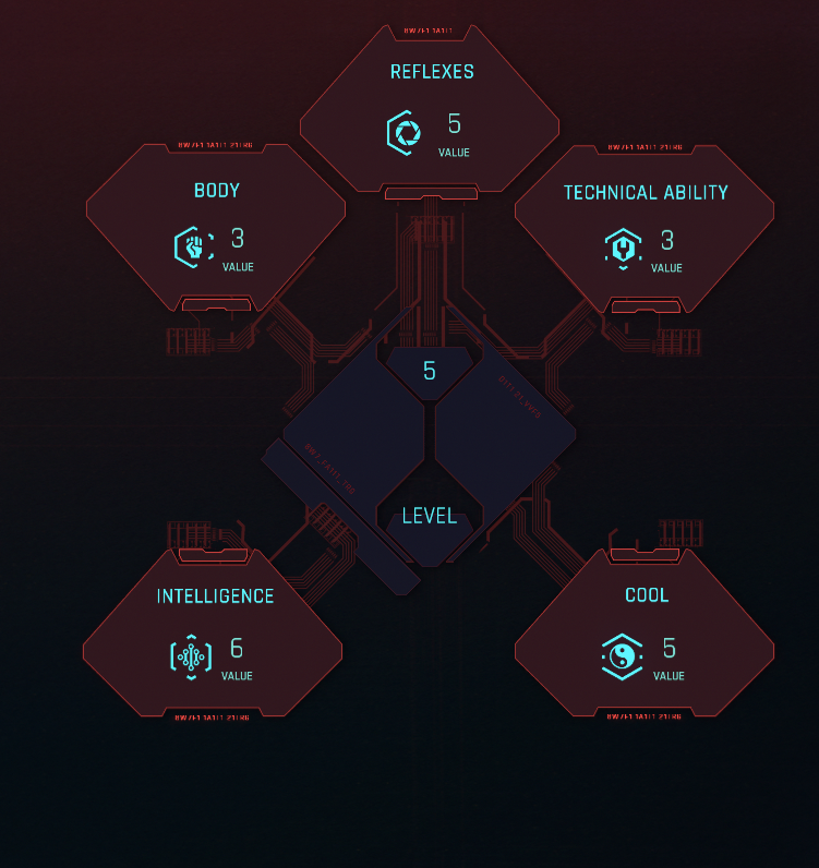 Cyberpunk 2077. Each stat affects different capabilities, such as