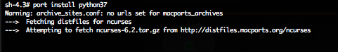 Then MacPorts tries to start a download of the source code for ncurses so it can start building it. That is good. That is working properly.