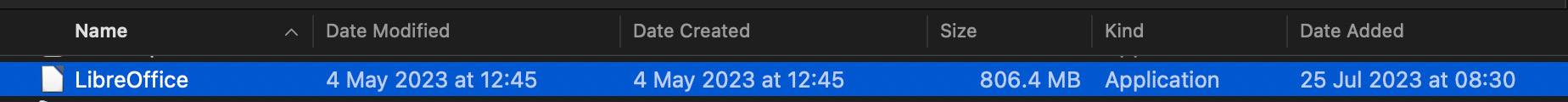 Then under the Applications folder, I clicked on the Libreoffice app and then I looked under the Get-Info summary page and the dates Created and Modified are from Aug 9th. Which does not make sense at all.