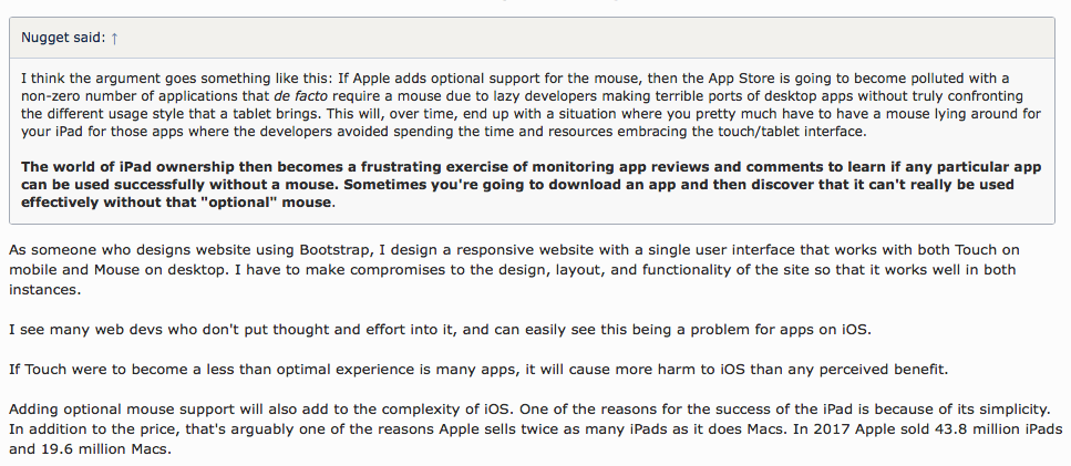But you keep ignoring any valid point, not even discussing it. It's as if you don't understand the difference between designing a UI for Touch versus Mouse, and just don't see the words on your screen every time the differences are pointed out.And as I’ve stated, I personally don’t see any valid concerns here, including the ones you’ve raised. Mouse support would in no way negatively affect the iPad, iOS, or users. It would be completely optional to use.