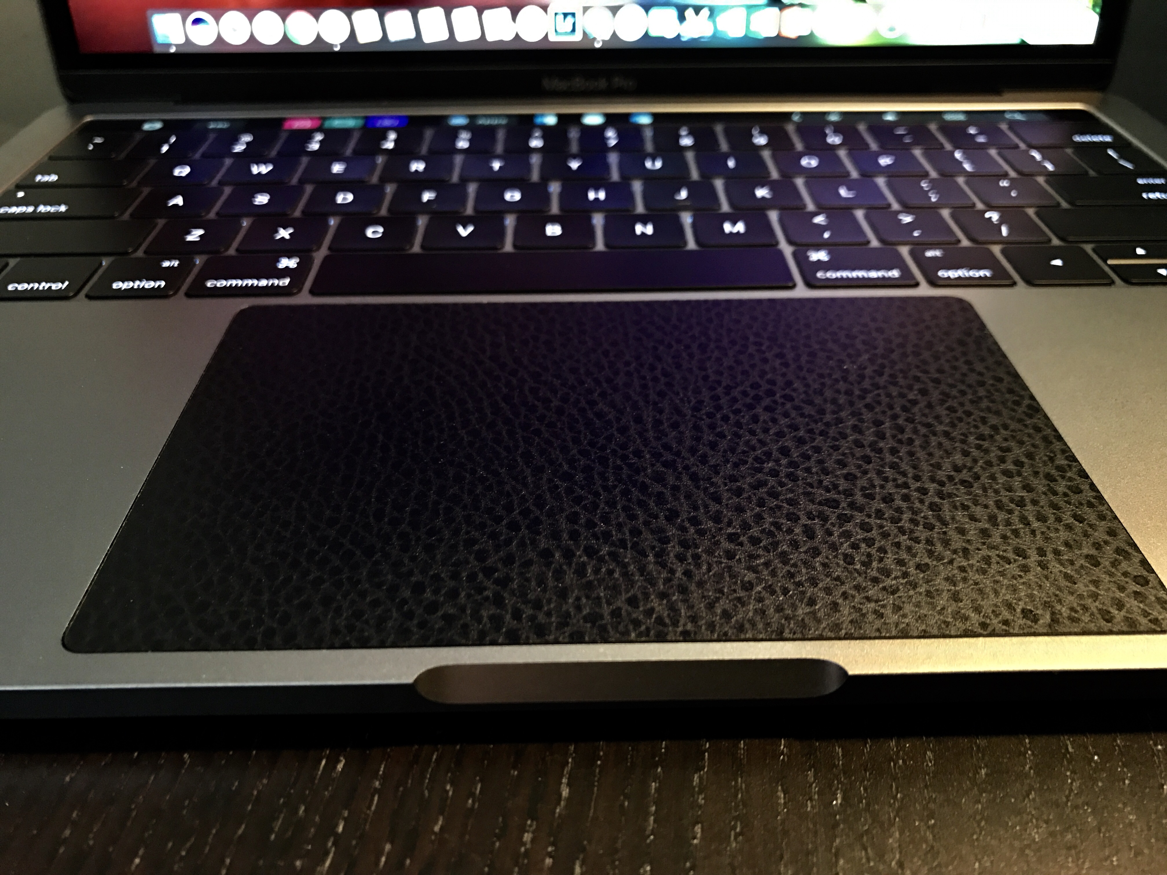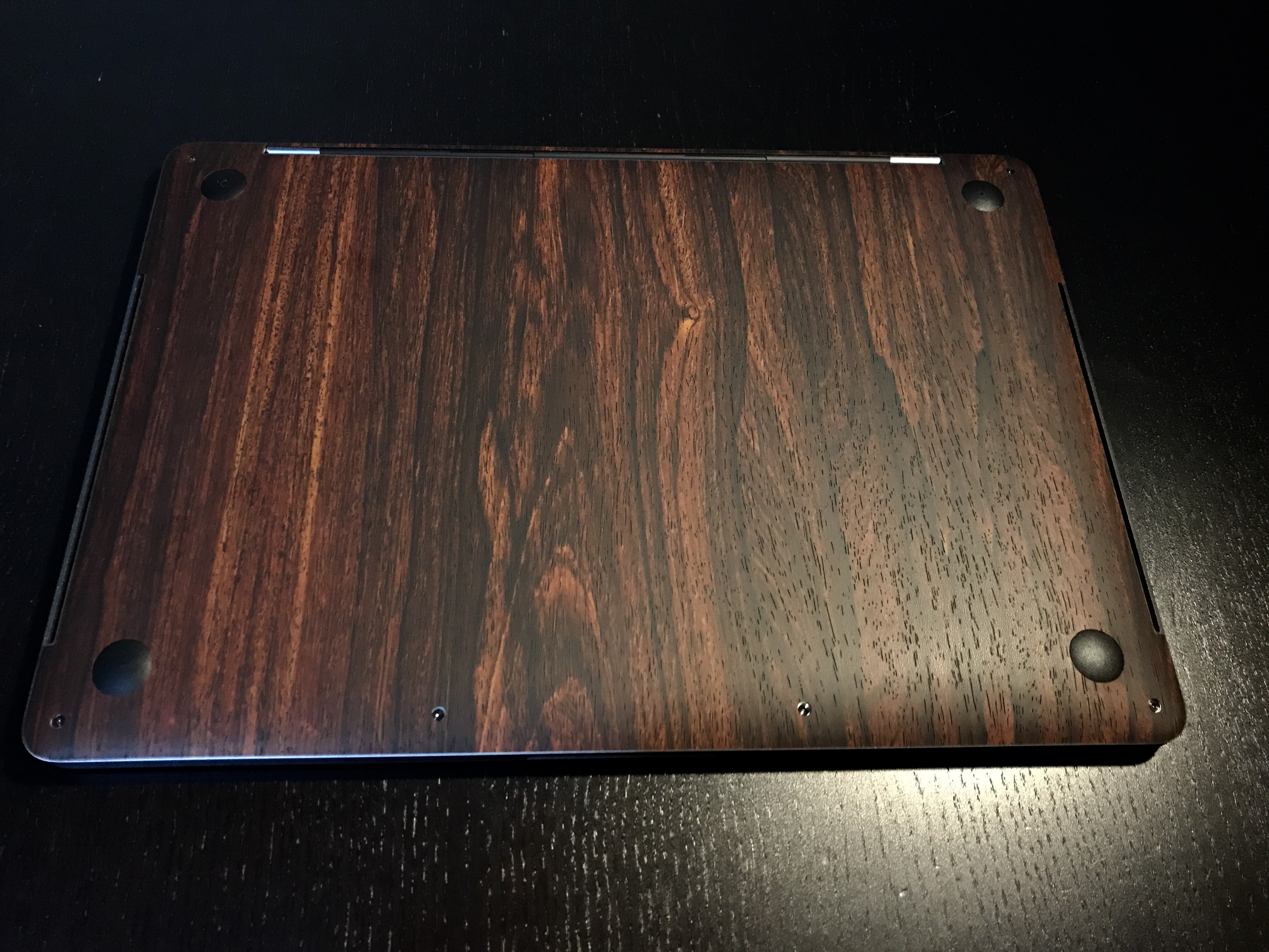 In case anyone is interested in buying a Dbrand skin, here is the mahogany MacBook Pro skin on my 13" TB model with a black leather trackpad.
