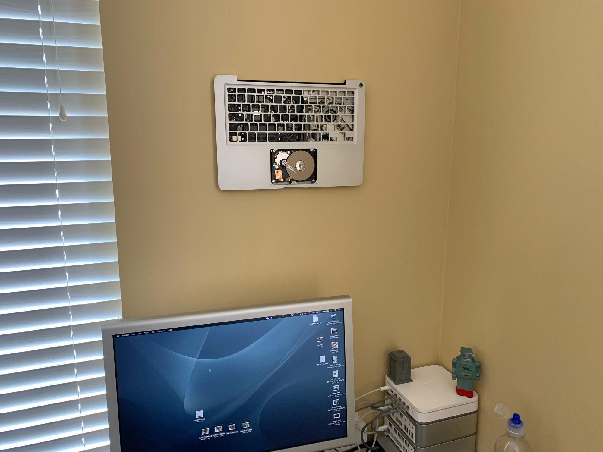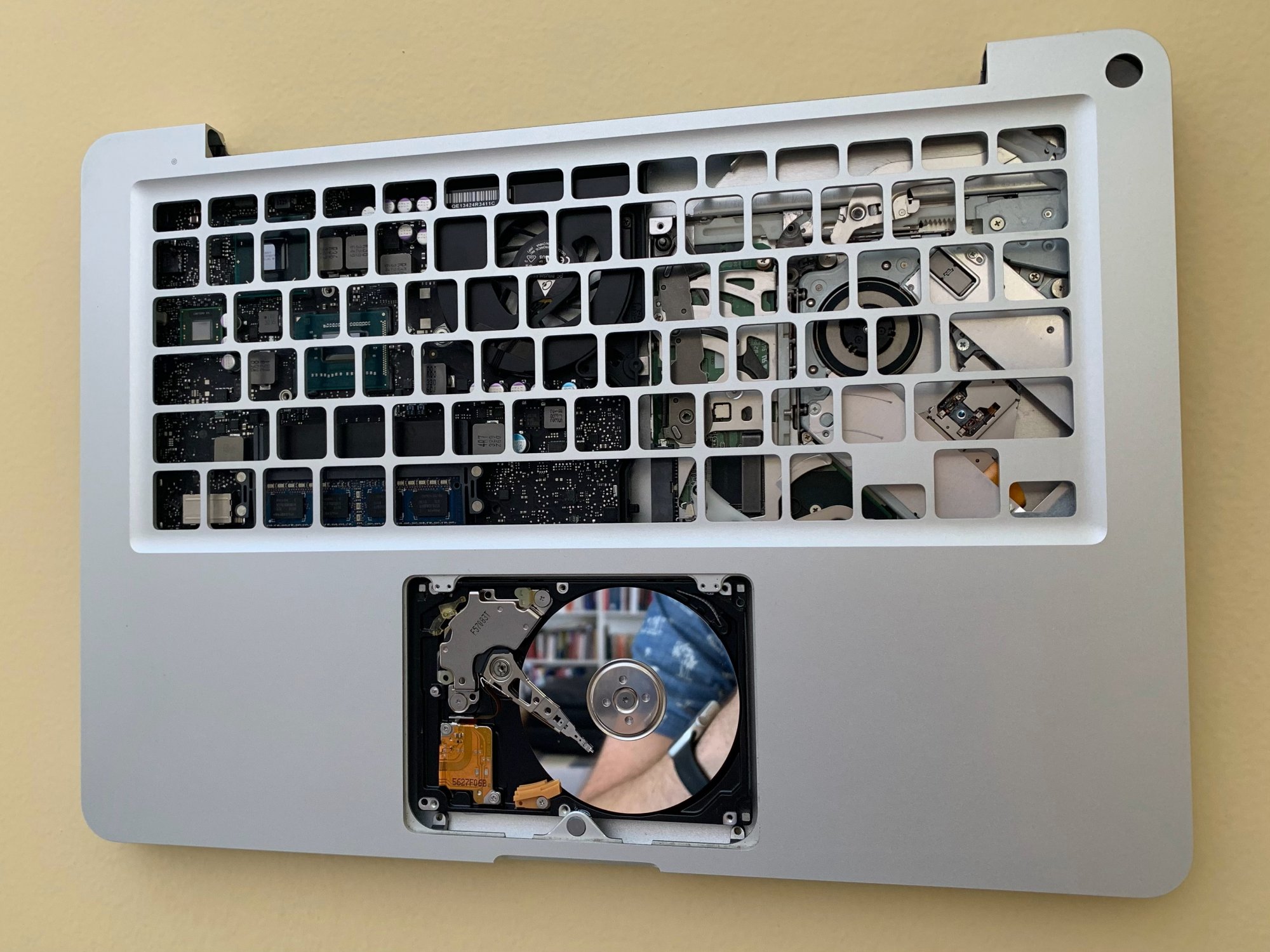 I'm not usually one to make artsy projects, but I had an idea while I was going through some of my parts machines. I came across a 2011 13" MBP with a water damaged logic board that I've been meaning to part out. The lobo and ODD are both toast, but the unibody is in great shape. As I was parting it out, I decided to give something a try - turning it into an exposed shadowbox kind of thing. I ended up being surprised at how it turned out!