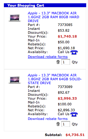 1.8GHz/64GB SSD MacBook Air: $3089 - $100 Rebate - $92.67 (3%) Instant Discount = $2896.33 ($201.67 off MRSP)