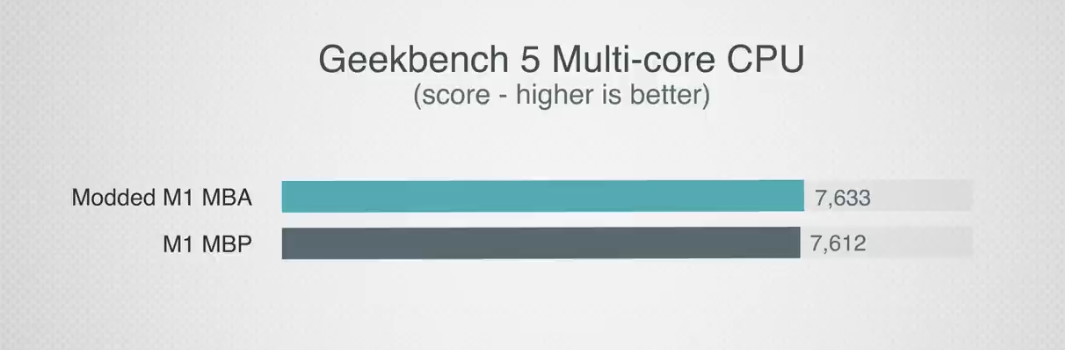 Saw online a DIY hack by buying some $20 heat transferring thermal pads and laid inside (roughly, nothing crazy... just dropped in there). It would basically allow an M1 Air behave like an MBP over sustained loads too:Try a 85˚F room, running Google Meet (much less efficient) instead of Zoom and maybe taking notes in a Google Doc at the same time for an hour. That common GSuite use case is way more CPU-hungry than it should be. The M1 Air does thermal throttle under heavy load, which is the only reason the Pro is faster despite having the same CPU.