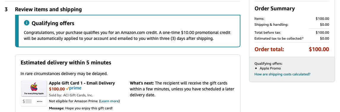 All of the Apple Gift Cards on this page are supported under the new promotion, as long as you customize one to be worth $100 or more. The gift cards are sold by ACI Gift Cards, LLC, which is owned by Amazon and was related to iTunes gift card discounts in the past.
