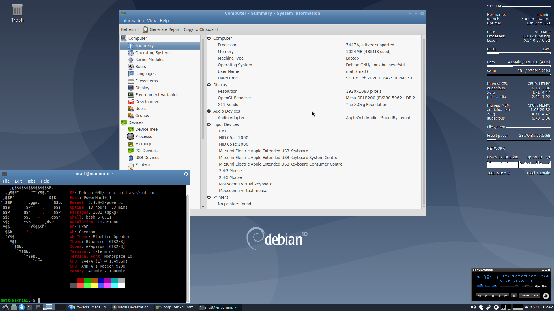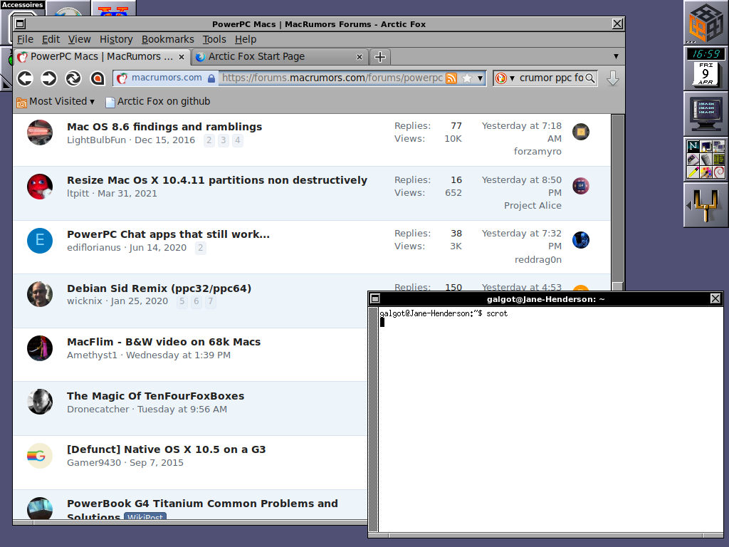 Would this remix work with installing Fienix? I am (still) trying to get my PPC32 bit G4 867Mhz, 1 GB RAM to accept and use a Linux system. The G4 employs an Nvidia GeForce4 MX GPU. I have a 17" Apple Cinema Display and a HANNS-G 1280X1024 (ya, I never heard of it either but it works and I paid $5 for it) LCD hooked up via the DVI port on the card. I currently have a Quicksilver G4 running dual monitors on Lubuntu remix 16.04 (ATI Radeon).Seeing as how installing Sid can be painstaking (downloading keyrings to a usb stick, missing wifi firmware, grub breaking and post-install hacking in yaboot, etc) i decided to respin a custom netinstall.iso. This iso uses yaboot by default so there are no hoops to jump through there. There is a nice walk through INSTALL.txt on the CD once the iso is burned. It will take you step by step to get everything set up (thanks @swamprock and @z970mp for the how-to's i borrowed some things from). PLEASE read it before (and while) installing. Copy it to another machine if you have to so you can look at it during install. There is also an "extras" directory on the CD. It includes arcticfox-27.9.19.deb, firmware.debs for wifi and the updated debian keyring.deb. Like ubuntu-ppc, this will install a 32-bit rootfs, but is able to use a 32 or 64-bit kernel depending on your machine. (G3/G4/G5)