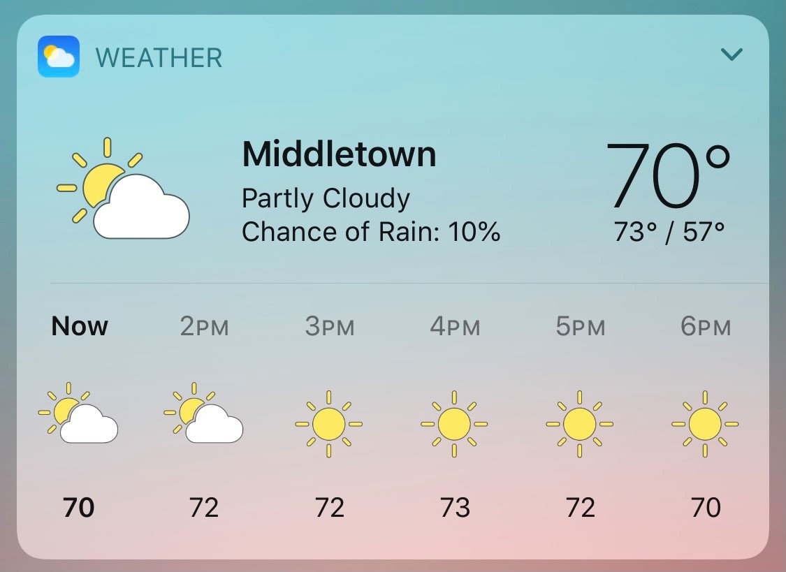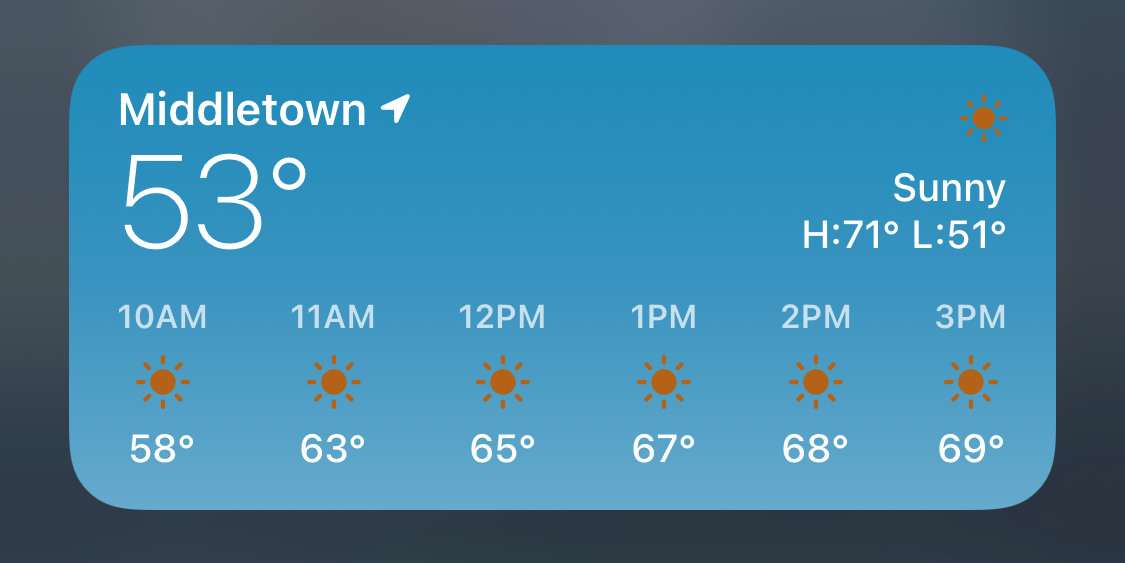 At least you get a sun, even if it’s the wrong colour! I put the large weather widget on both my iPad and iPhone, but for next Wednesday it shows a crescent moon for the day, and other days a moon poking out from behind a cloud..! I removed and readded the widgets, rebooted both devices, but still didn’t fix the issue. (I’ve now changed it to the middle size widget on both devices, which at least shows the proper detail for the next few hours for the current day.)