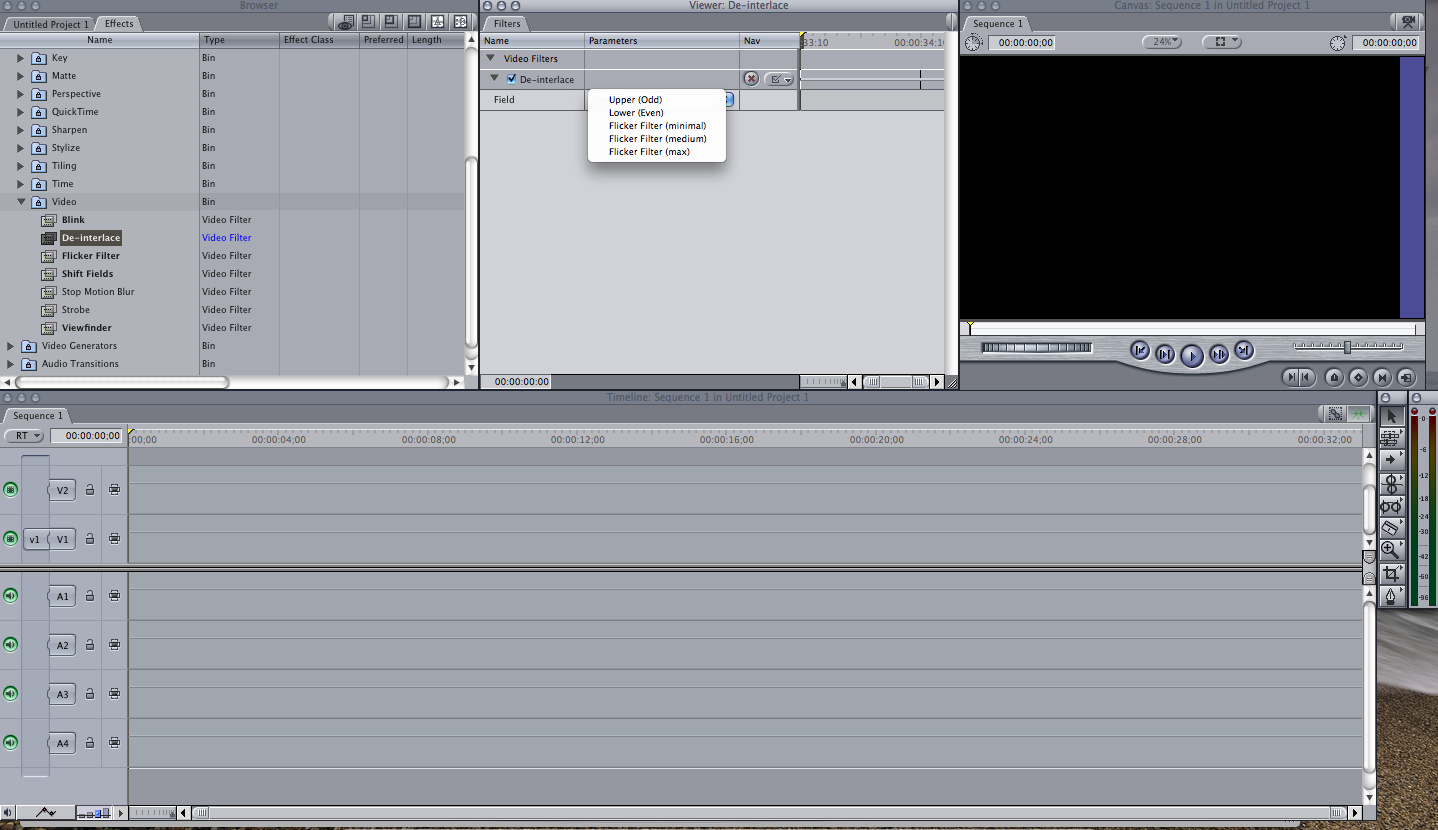 If i shoot some footage on my Canon HF10 using 1080i60 settings, then do all of my editing in final cut express 4 with the timeline set at AIC 1080i60. How/what form of deinterlacing should i do to resize my video to 720p? FCE4 under Effects ---> video filters -----> video ----> de-interlace, gives me these options. thanks.