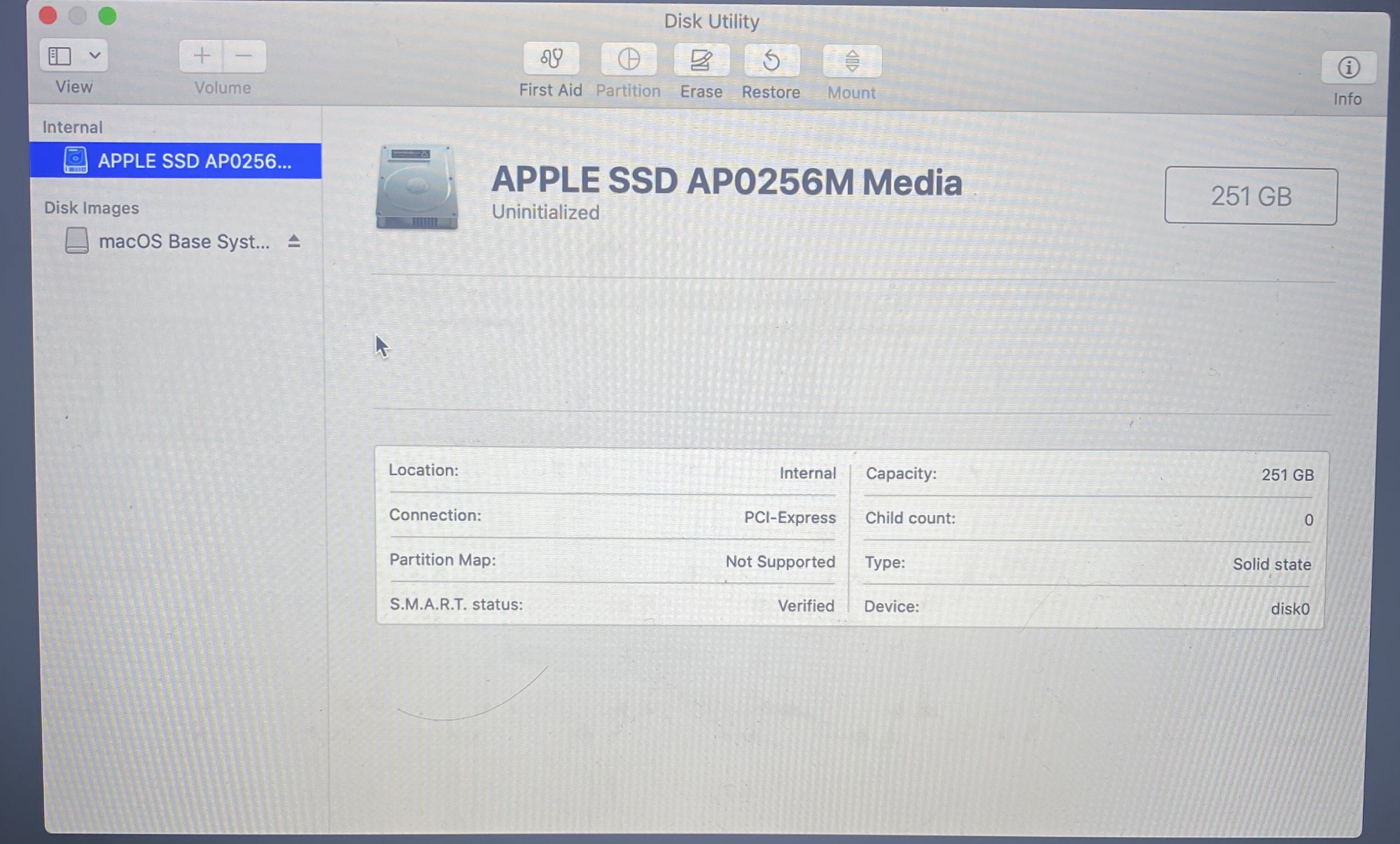 I recently installed Big Sur on my MacBook Pro. I hated it so I tried to go back to Catalina. When I erased the partition somehow I deleted it and now I am left with Mac OS base system and above it there is the uninitialized APPLESSD APO256M Media. I can’t seem to create a new partition for Macintosh HD to install the OS and I’m freaking out!!! Can someone please help me?!?