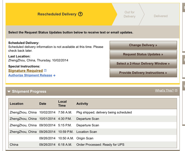 Shanghai, China 09/29/2014 9:25 P.M.Your package is in transit. We're updating plans to schedule your delivery. / The package will be forwarded to a UPS facility in the destination city.