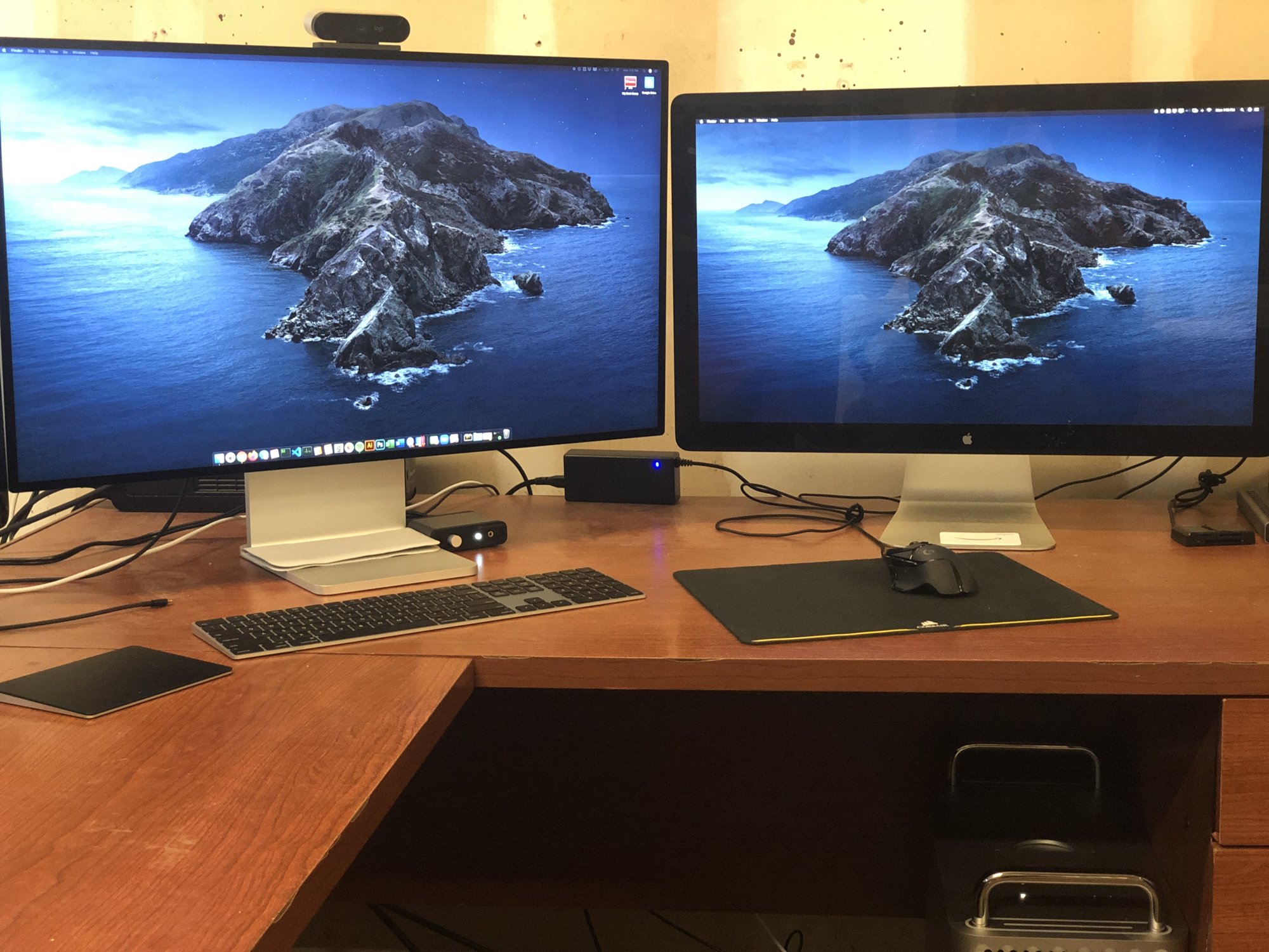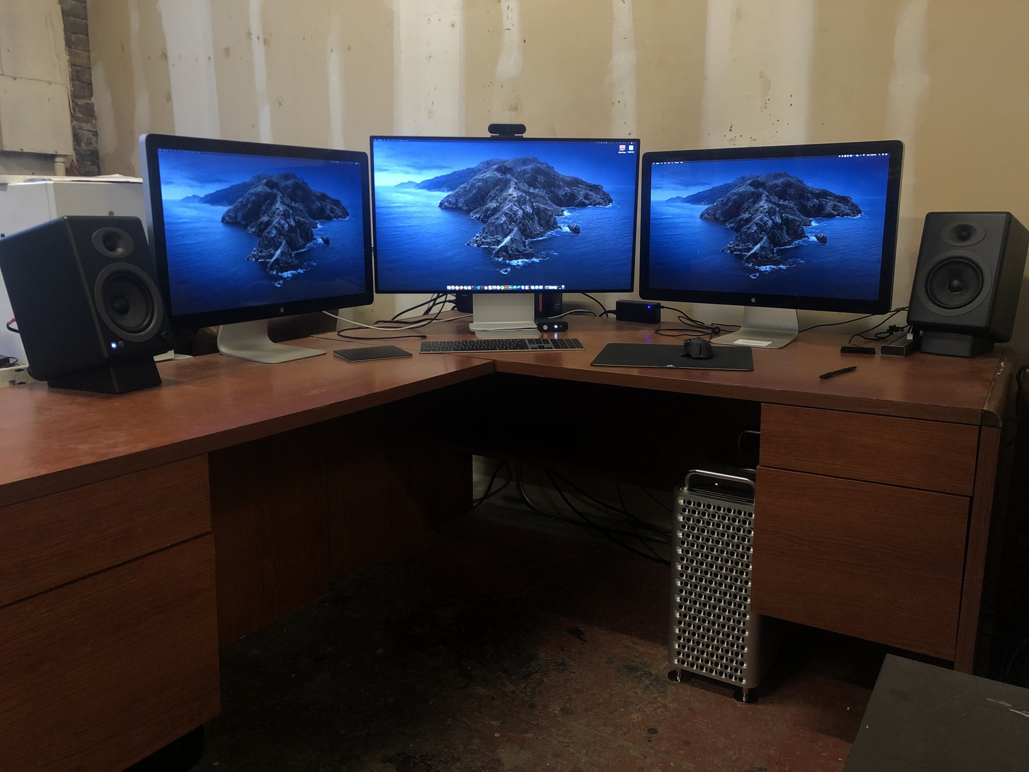 lol I had forgtten how awful those bezels n the TB displays looked. Just Wow. The XDR looks SO stunning, I'm really worried about my upcoming two monitor setup with a Dell 5k next to the XDR.... (at least till I can affrd a 2nd one grmrrll)Here's the Standard XDR between two Thunderbolt displays. The reflectivity on the TB displays is WAY WAY worse than the XDR. To my eye, it appears to have no reflectivity at all in comparison.