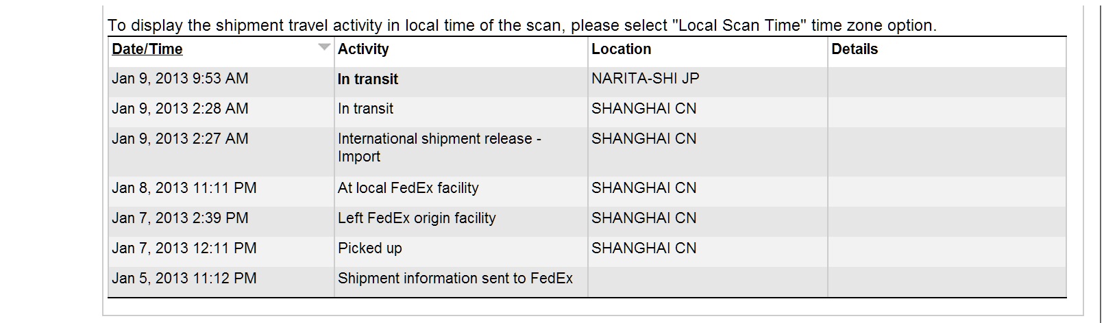 i meant local scan and date....yea nothingAt cursory glance it looks bizarre.Try setting the tracking page "Select time zone:" to "Local Scan Time" time/date as Anchorage is on the other side of the International date line.