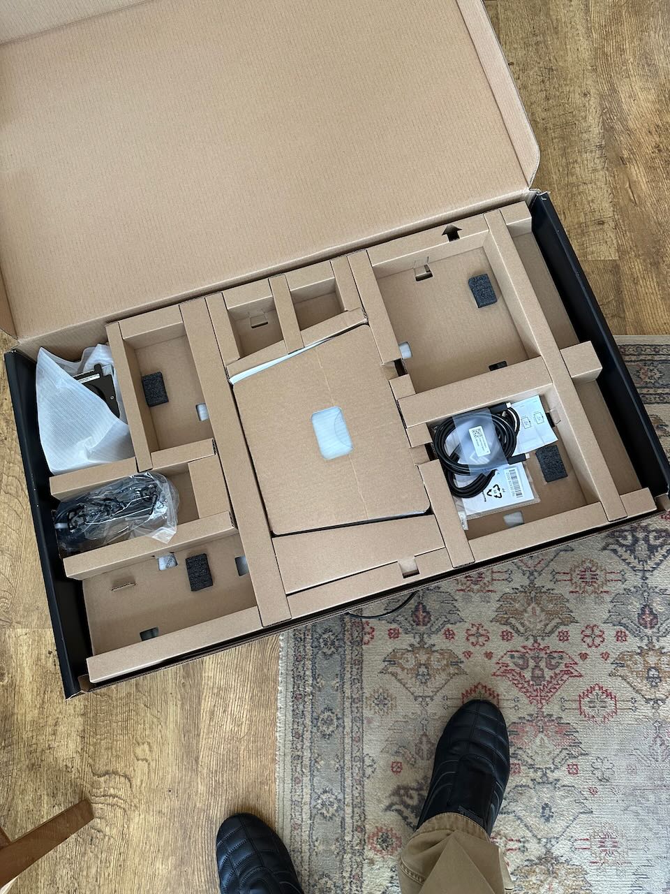 And we're here! This is a hell of a monitor, 18Kg delivered, which meant a flipping heavy box! It took about 10 minutes to assemble and lift on to the desk, moving the old Samsung monitor back towards the rear of the desk to accommodate it. The large desk comes in handy at times!