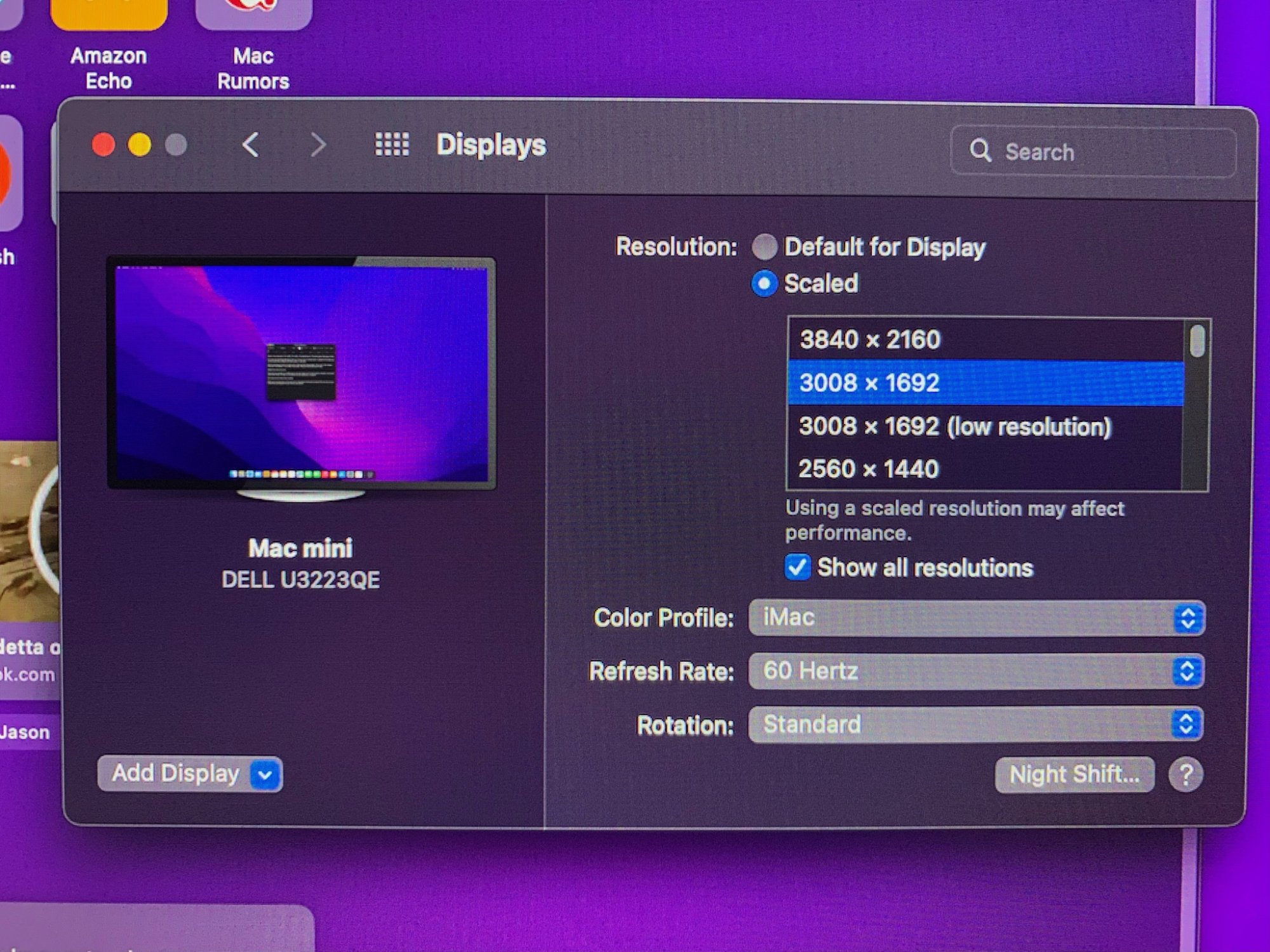 (3) With the HDMI connection I do not get as many options in resolution scaling on the Mac mini like I do when using the USB-C / Thunderbolt 4 cable (it steps from 3840x2160 to 2560x1440 to 2304x1296 to etc. No 3008x1692 seems to be available via HDMI).