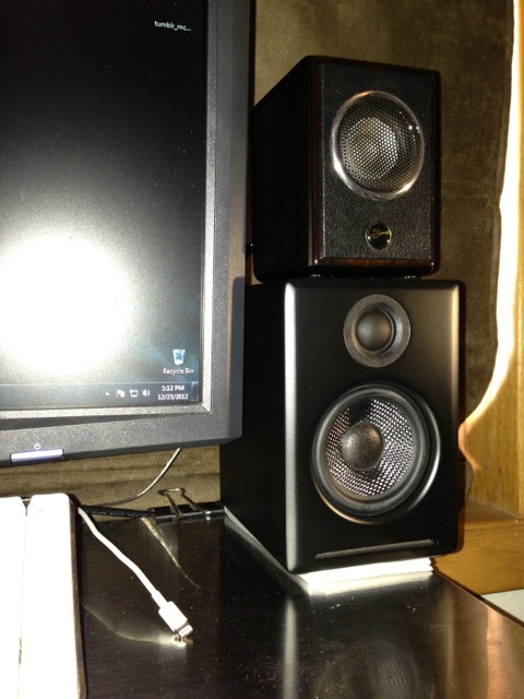 Since I have 2 computer systems at my desk, I am splitting them up, to give them each their own speaker systems. For my PC desktop, I ordered a set of Swan H2 speakers that I plan on stacking on top of whatever I buy for my Mac Mini.