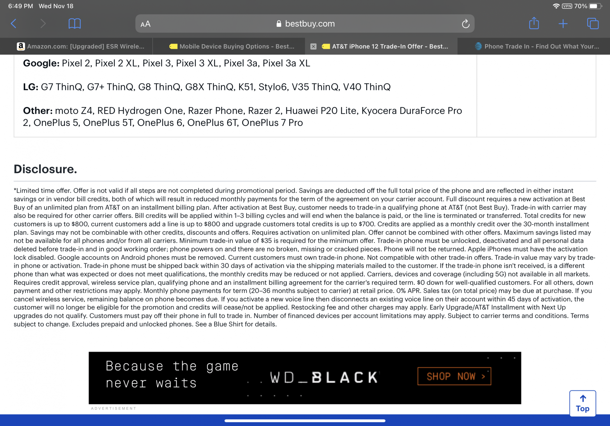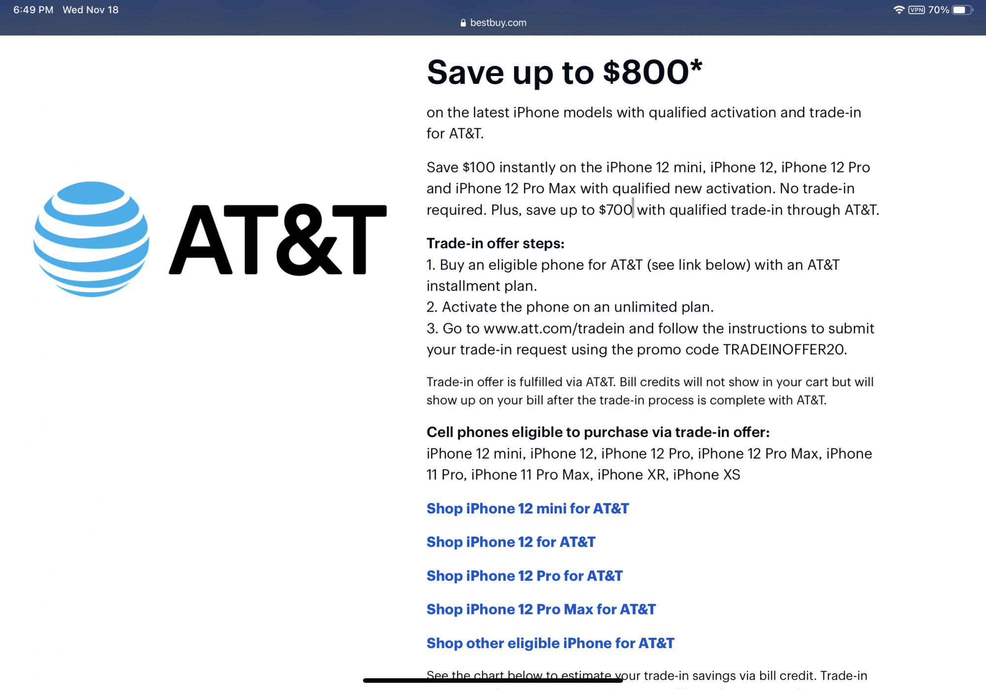 Last September I called AT&T to inquire about the promotion trading in my old iPhone 8+ to receive $800 or $850 credit to be applied monthly to my bill. I was told to be eligible I needed to upgrade to the unlimited plan, which I did, and then to purchase a new iPhone and go to a particular website to do the promotion. I purchased my iphone at Apple and did exactly what the detailed in the promotion guidelines. At NO point was I told I had to purchase this new iphone through AT&T under a payment plan.