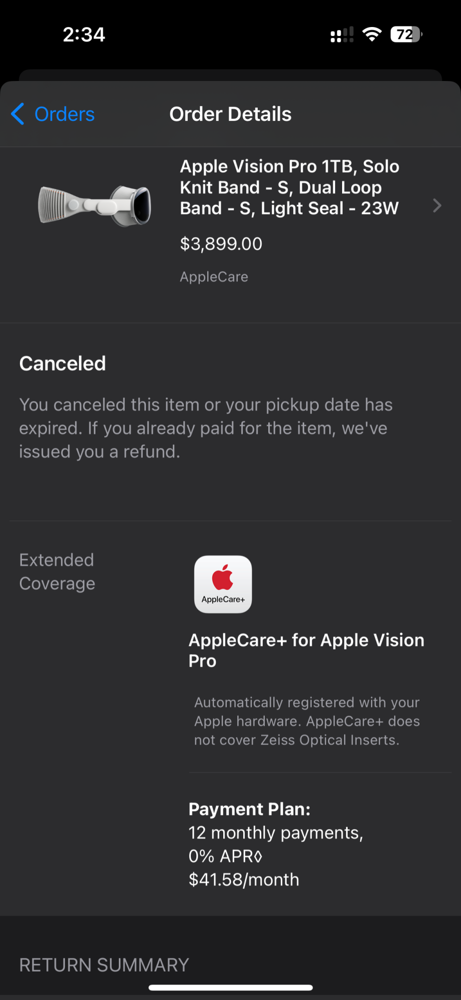 I was looking through the settings this morning and noticed that my AppleCare+ had not activated on my Vision Pro, so I went to go check my orders. The order that I picked up is cancelled? I realize now that I didn’t get any sort of pick up confirmation on Friday. Any idea what the course of action is for this?
