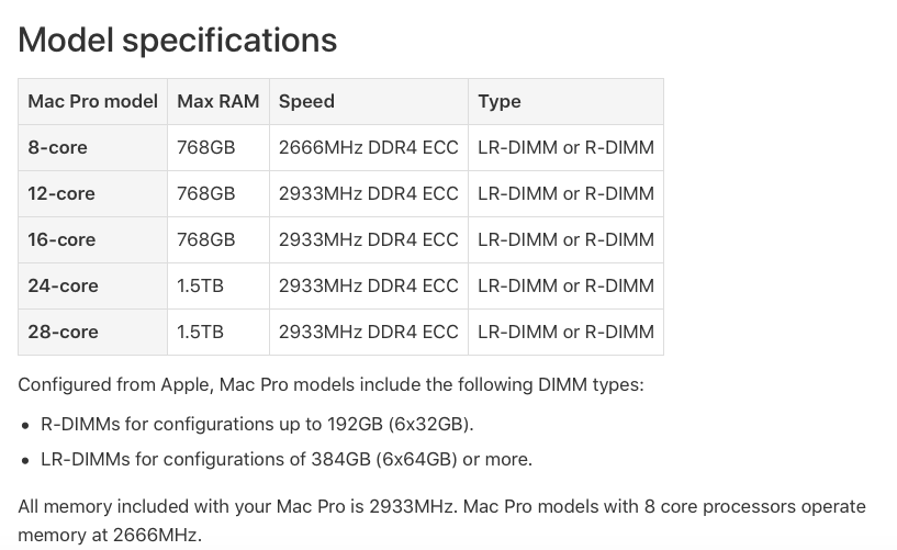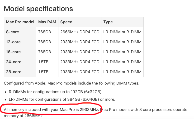 Hello everyone, I have an issue. I bought the 8 core Mac Pro with the intent of one day upgrading the CPU and also I read this line "All memory included with your Mac Pro is 2933MHz. Mac Pro models with 8 core processors operate memory at 2666MHz" from this Apple Link https://support.apple.com/en-us/HT210405. So to my surprise on https://everymac.com/actual-maximum-mac-ram/actual-maximum-mac-pro-ram-capacity.html it clearly shows that the 8 core model ships with 288-pin PC21300 DDR4 LRDIMM memory module which run at max speed of 2666. My question is this, am I missing something or should I return this machine (I have one day left) and get the 12 core Mac to get the faster memory? Also is this false advertising? I wanted the memory I paid for (equal to all the models) to be the same memory as promised.
