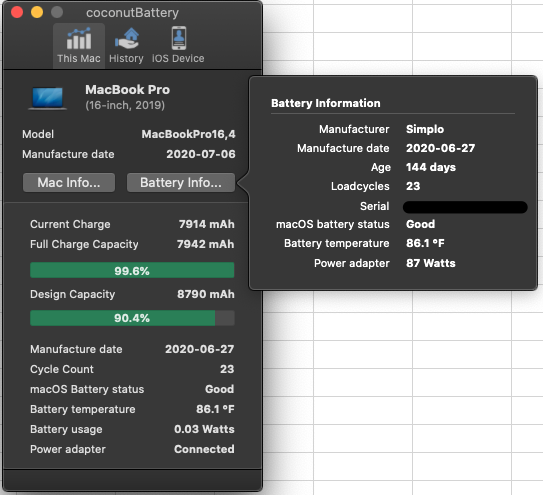 Here's more detail on mine, with battery health management on. Mine is Simplo battery and my MBP is plugged in almost all the time.