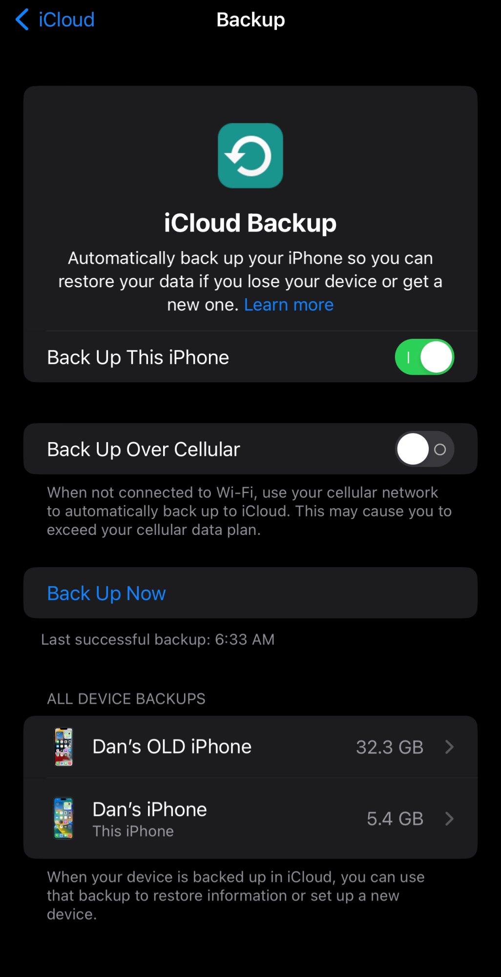 Also when I go to Settings > AppleID > iCloud > iCloud Backup - there's a pretty huge difference from my new phone to the older one. The new one only has 5.4GB backed up (just updated a few min ago to make sure) and the old one there is 32.3GB total that's back up. (Screenshots attached).