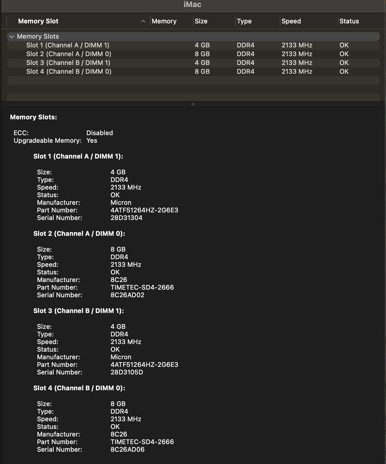 However, notice that the speed has dropped from the normal 2667 MHz to 2133 MHz. This, unfortunately, is the quirk of the 2020 iMac which is: if the Part Number in slot 1 does not match exactly the Part Number in slot 2, or the Part Number in slot 3 does not match exactly the Part Number in slot 4, the speed will drop to 2133 MHz.