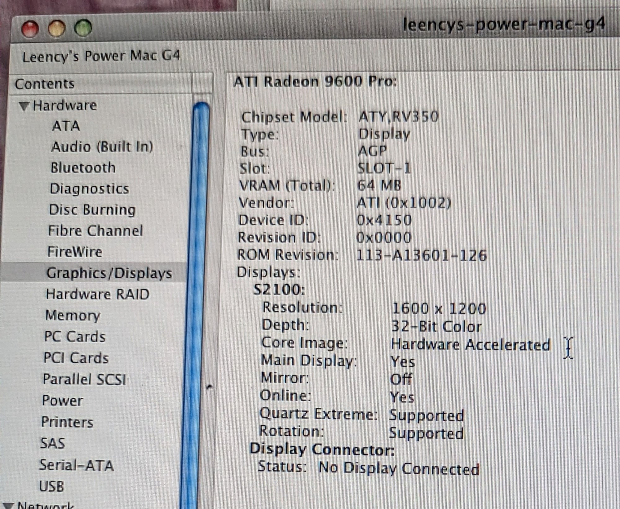 So, I've got a 466MHz Power Mac G4 (Digital Audio model.) It's in fine working condition and works perfectly with the stock ATI Rage 128 Pro installed. Anyway, I recently upgraded my G5 tower from a Radeon 9600 XT to an X800 XT, and decided I'd try sticking the 9600 into the G4, as it'd be a nice improvement over the oldschool Rage card. The 9600 is in perfect working order.