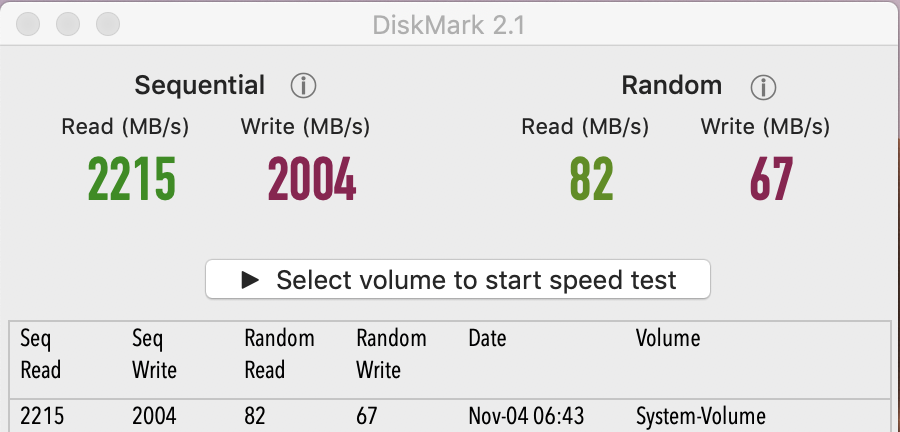 very different results (this example shows the difference between the benchmarks of the 256 GB MBP nTB using Blackmagic vs. QuickBench.) Simple things like the size of the SSD (larger sizes = higher write speeds, usually), to the size of the transfer files, to the amount of free space on the SSD, to the programs running in the background, to the (recovery) pauses in test intervals, to whether or not indexing is enabled or not (as the OS may try to index the test file), to the compressibility of the data can have a significant impact on outcome - then there's the technical variables such as the workload's IO intensity and the testing's queue depth, to which my own understanding is limited-at-best.
