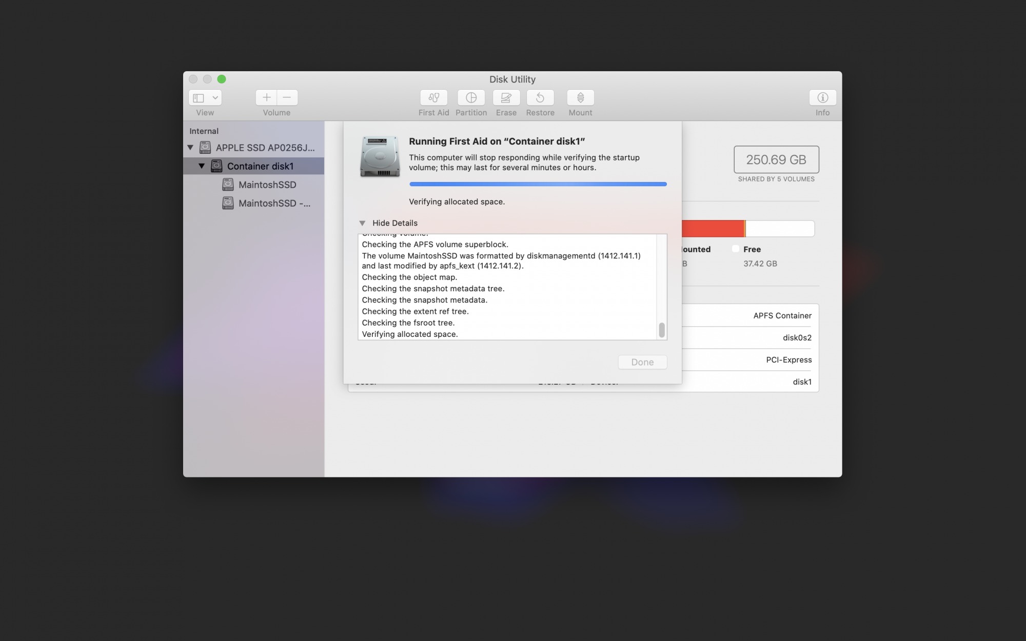But, try the First Aid after some simple steps: Shut off your Mac, (shut off completely, not just a simple restart) then boot to the Recovery system, then Disk Utility, and run First Aid on the container, not the snapshot. If you do not see any Container listed, Go to the View menu, and choose "Show all Devices", then select the container, and run First Aid.