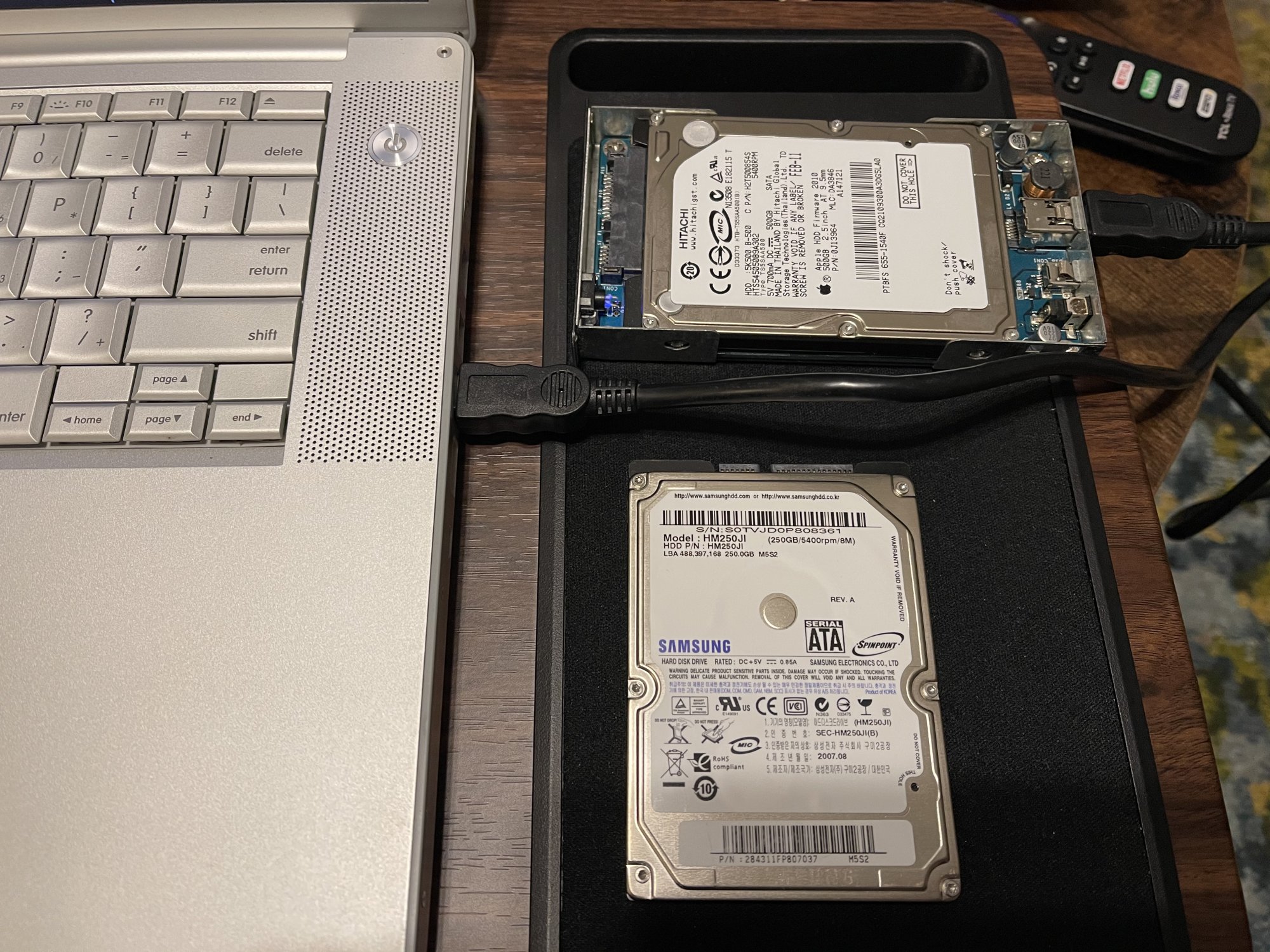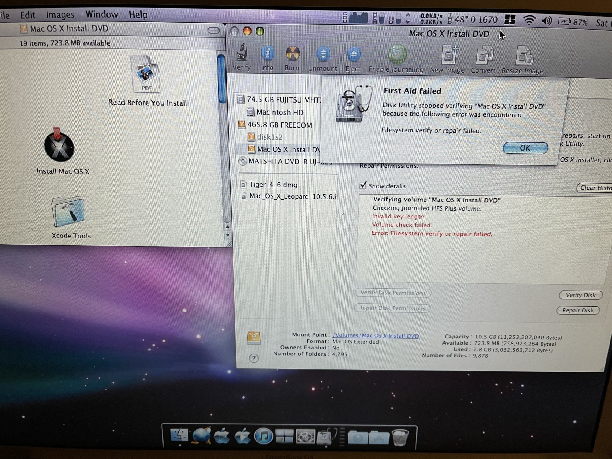 Plugging the drive into my TiBook produced the same errors, with all partitions being unrepairable. Luckily, all the files that had been on it were backed up online, the various OS disk images could be redownloaded, and it would only take me a few hours to get it all set back up again, so I figured I'd just erase the entire drive and try again. First thing I did was try to create a 10.4 install partition again on the AlBook to see if it would happen again, and sure enough it failed in the same fashion. I was pretty convinced the drive was dying as it was over 10 years old and I couldn't think of another reason this might be happening. Just for fun, I tried it on my TiBook with the exact same dmg and to my surprise it worked perfectly. I erased it and did it a 2nd time and it again worked just fine. So I went back to the AlBook and tried again (this is when I took the above photos) and it failed in the exact same way, again corrupting the entire drive. So now I'm stumped as the drive doesn't appear the be the issue.