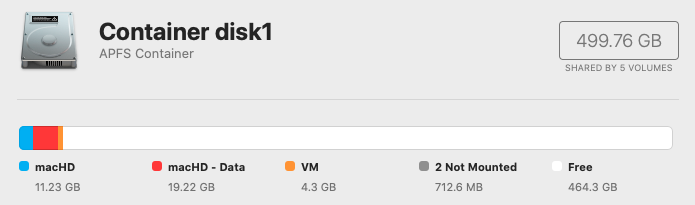 DiskUtility: Volume count 5: 2x APFS volumes. 1x VM. 2x not mounted. (Screenshot attached).