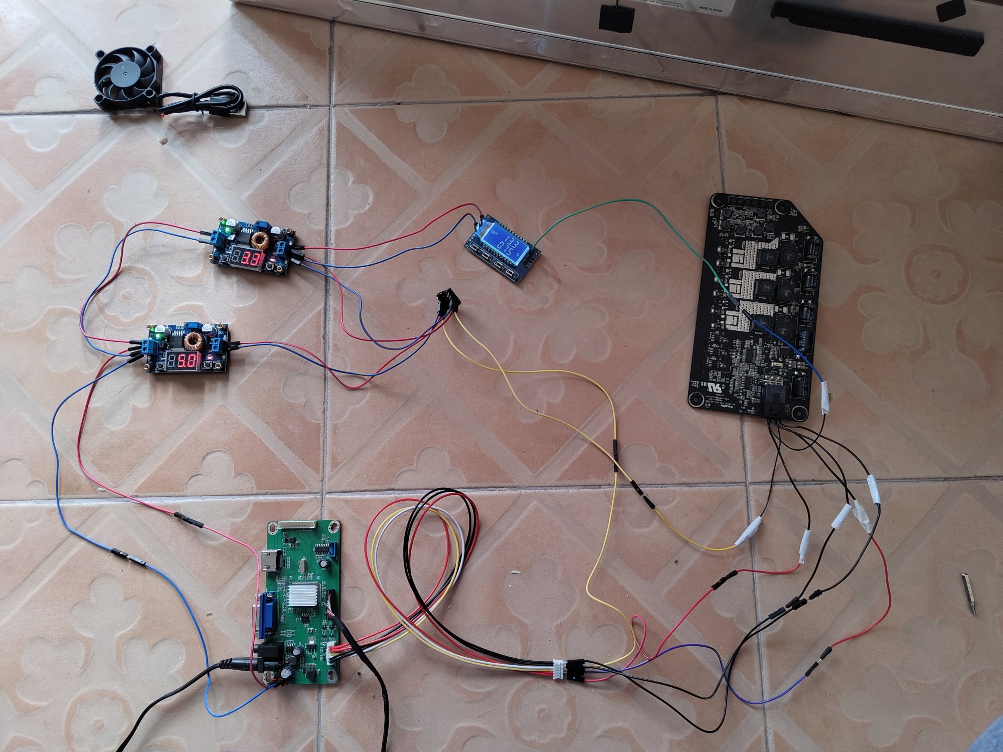 It's great that it works, but as expected, the brightness is a bit dim, especially when compared to the original screen of my iMac 2011, which is placed beside the converted monitor. Earlier in this thread, I remember some users reporting that they just connected the wires from the board to the original inverter of an iMac 2010 and it just worked (without PWM board, stepdown converter etc.). Also, one of the reviewers on the Ali product page posted an image, where the 6 cables of the board were connected to the black plug of the original Apple inverter. Unfortunately, the resolution of the photo is too low, so that it's not possible to figure out the exact pinout.
