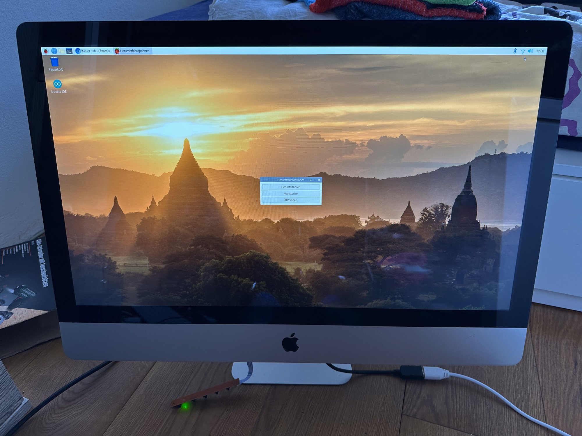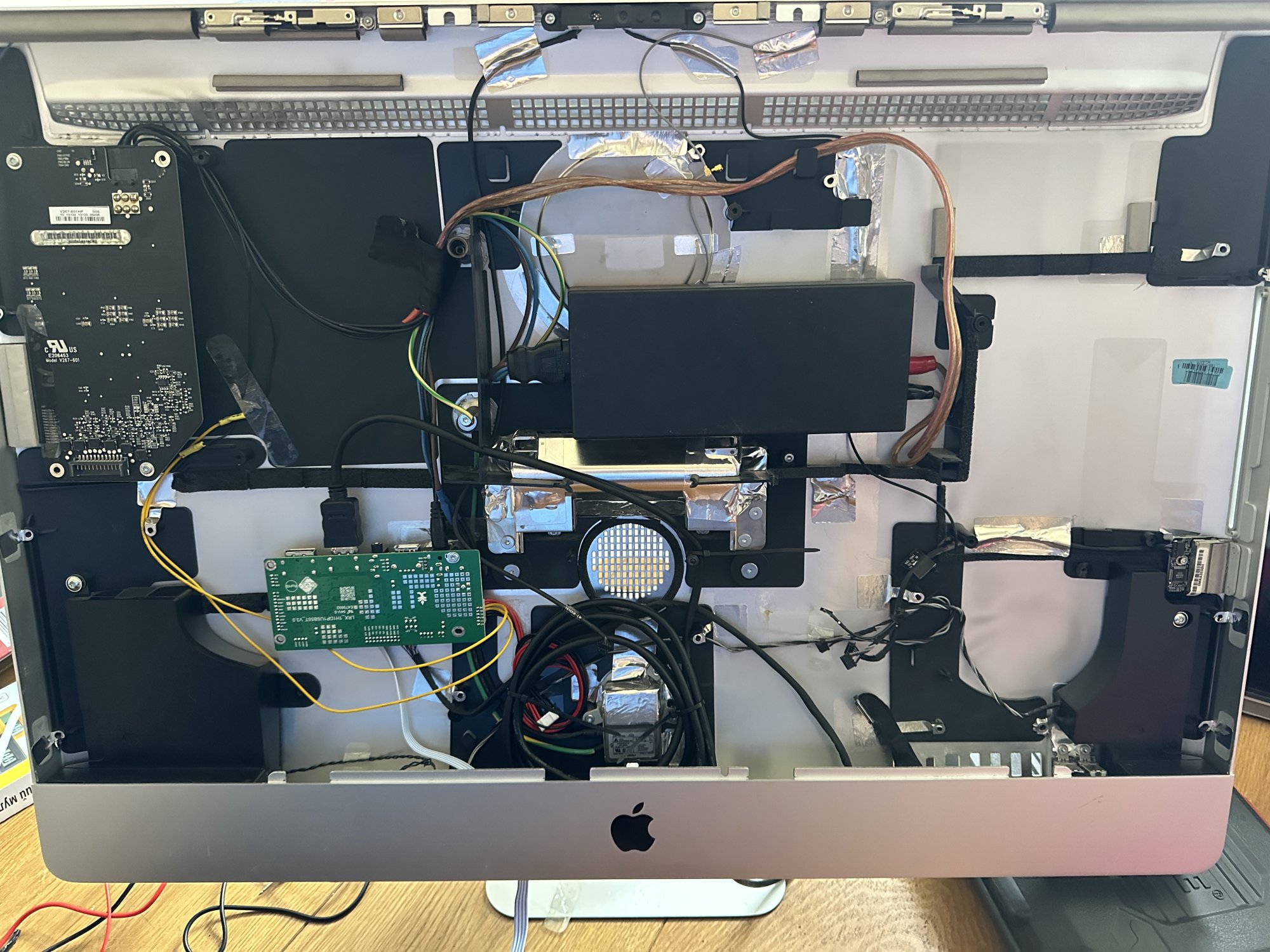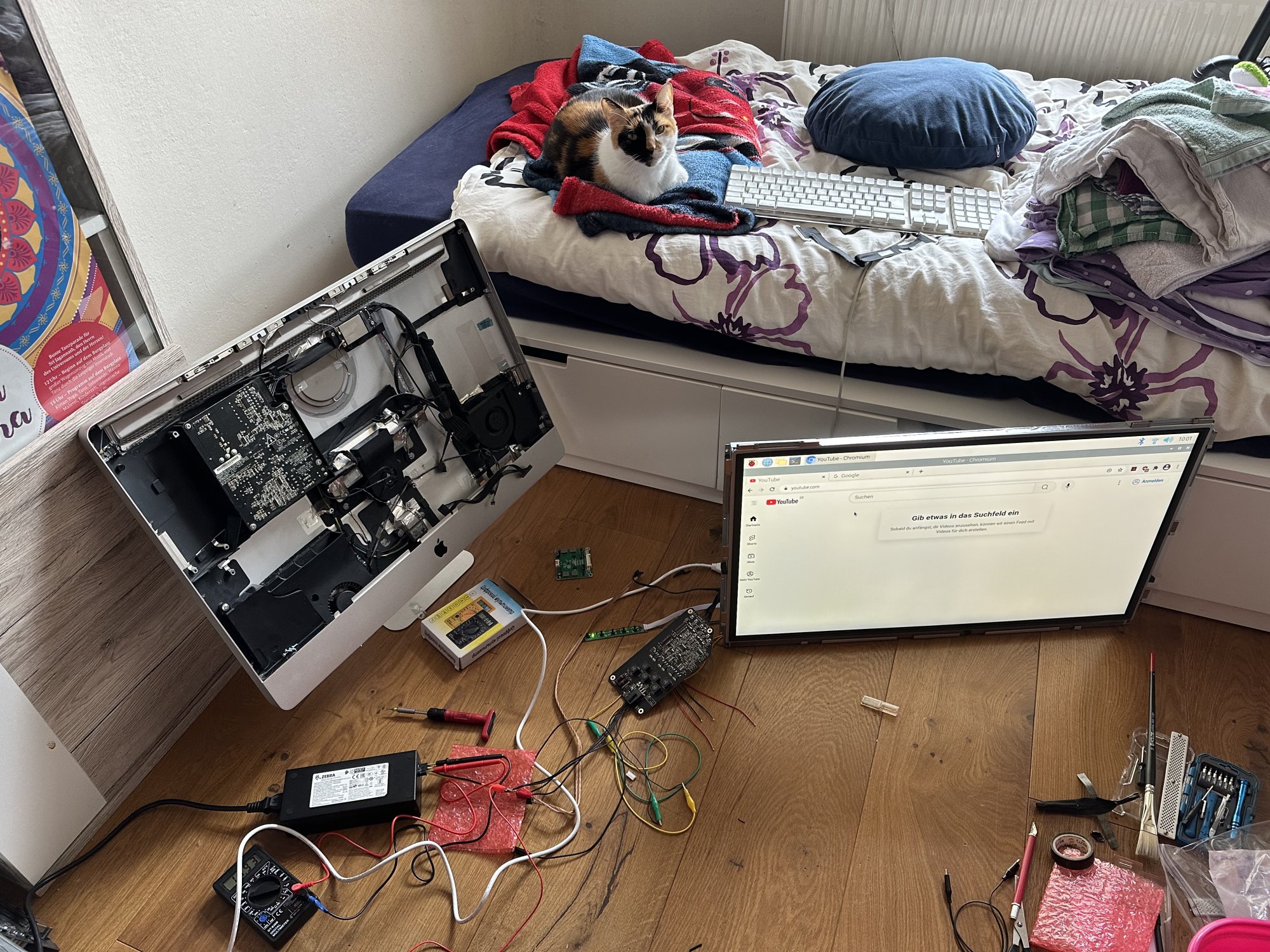 thanks to this thread and to several youtube videos, I also accepted the challenge and converted an iMac 2010 27", which had a broken mainboard, to an external display. It has the LM270WQ1-SDC2 panel and I ordered a board with DP, HDMI and 5V USB jacks. With the first board, the DP port was broken, but the seller from Ali sent a replacement part which finally works. I use the permanent 12V supply from the original PSU and I soldered the power button to the small keyboard that came with the conversion kit. At the moment, I am using the Chinese inverter board.