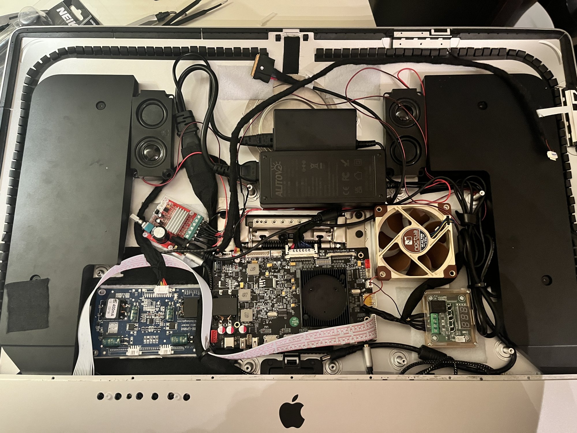Well I've finally completed my build based on the R1811 LCD driver board. I followed the guidance in this thread and others but also put my own spin on it. I was concerned about installing every component in the iMac case including the driver board power supply. I thought heat build-up could be an issue with the power supply in the case. I have had similar power supplies fail in the past so I thought it's possible it may need to be replaced in a year or so. Lastly I wanted access to the driver board to easily plug in devices and also potentially upgrade the driver board in the future. I have no desire to open up the iMac again once it is sealed so mounting these externally was key.