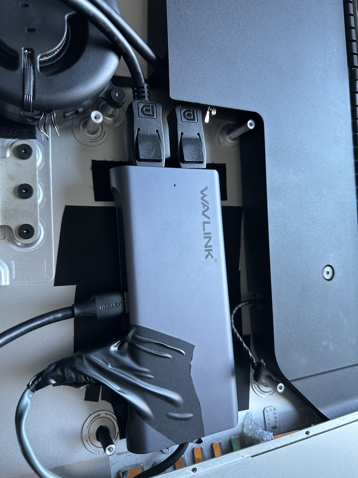 My 2014 iMac 5K (SDA2) recently failed (seemingly the logic board—fans would spin blast on boot). I thought I'd open it up and give the monitor conversion a go. I picked up a R1811 board and CableMatters DP-to-USBC cable.