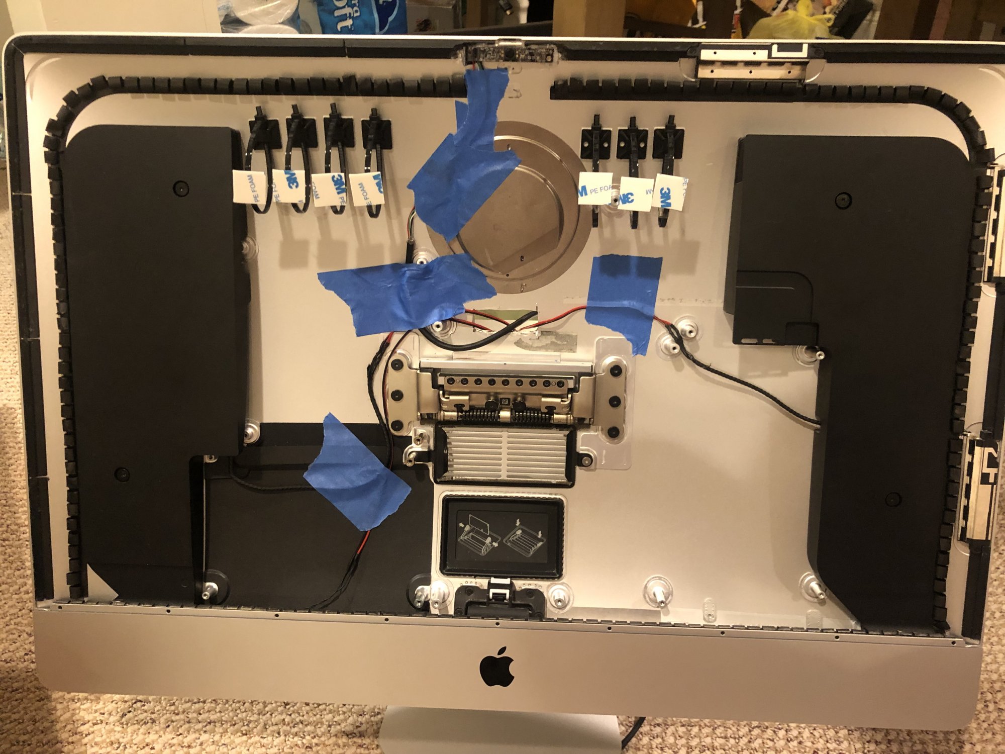 During my research I read about people replacing the LCD screens on iMacs, only to have them come apart and crash to the floor at some point. To address this, I installed a series of zip-ties with adhesive mounts to catch the LCD as emergency straps just in case it separated from the iMac case.