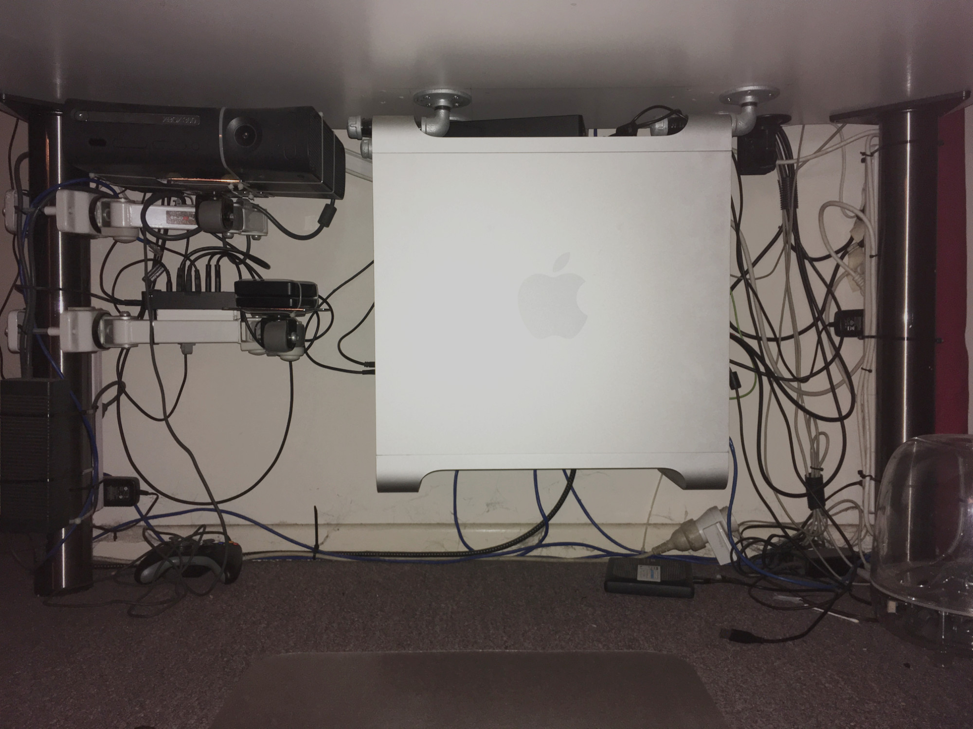 Two wooden planks approriately sized, glued together maybe. Four holes drilled through both. Attached to the table with screw lengts according to your desks dimensions (vertical height of the table top).
