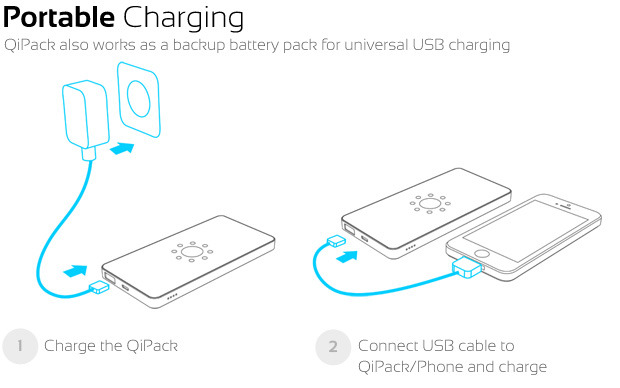 PS: for first time use, you need charge the QiPack before using, because, there is a built-in 3000mAh li-ion battery pack in QiPack.