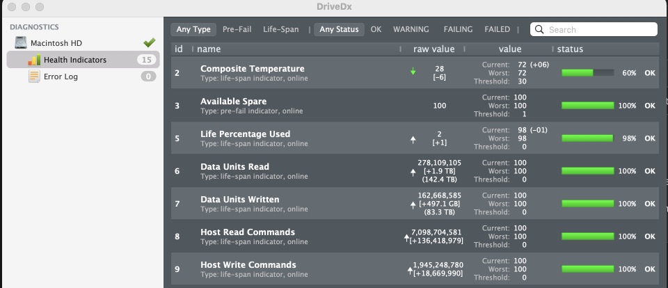 You'd think my laptop would be wreck, but here's are my drive health stats after 2 years of not paying any attention to the color of my memory pressure chart or obsessing about swap numbers.