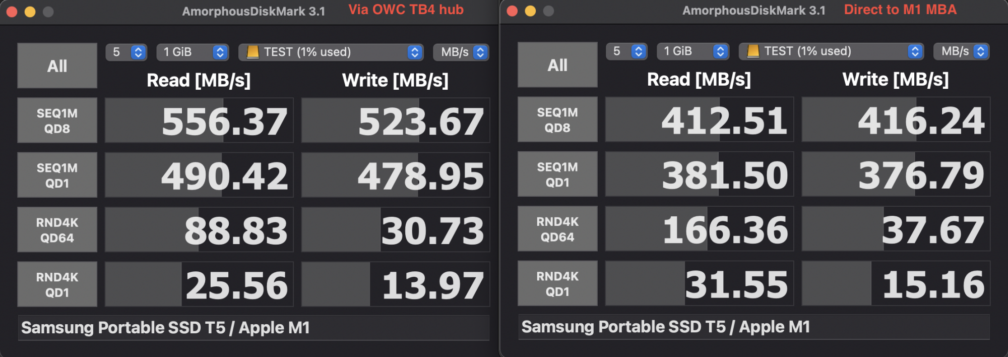 In the above test the Samsung T5 (256GB) was faster connected via the OWC (four port TB4) hub, than connected direct to my M1 MBA.