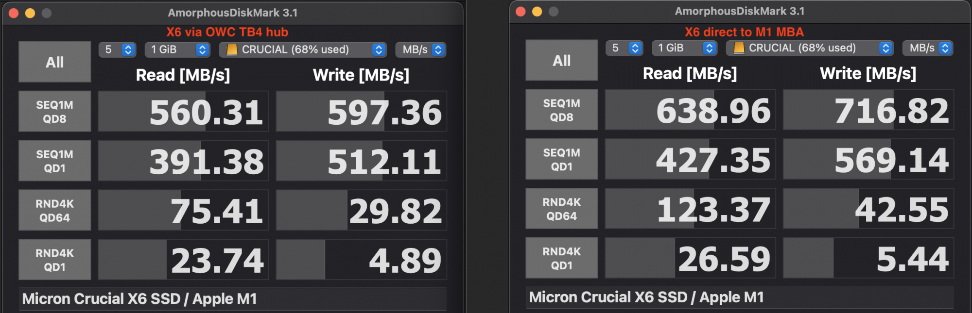 In the test of my Crucial X6 (4TB) below it is the other way round. The X6 is faster when connected direct to the M1 than via the hub.